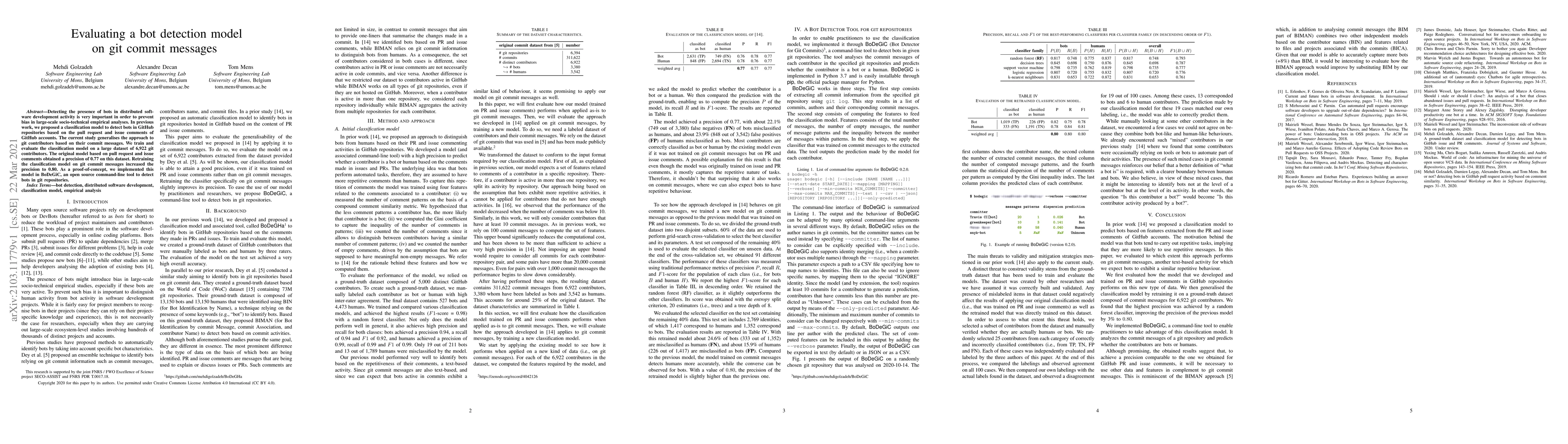This study evaluates a bot detection model generalized to git contributors based on their commit messages, achieving a precision of 0.80 on a dataset of 6,922 contributors, improving upon the previous model based on pull request and issue comments. The model is implemented in BoDeGiC, an open-source tool for detecting bots in git repositories.