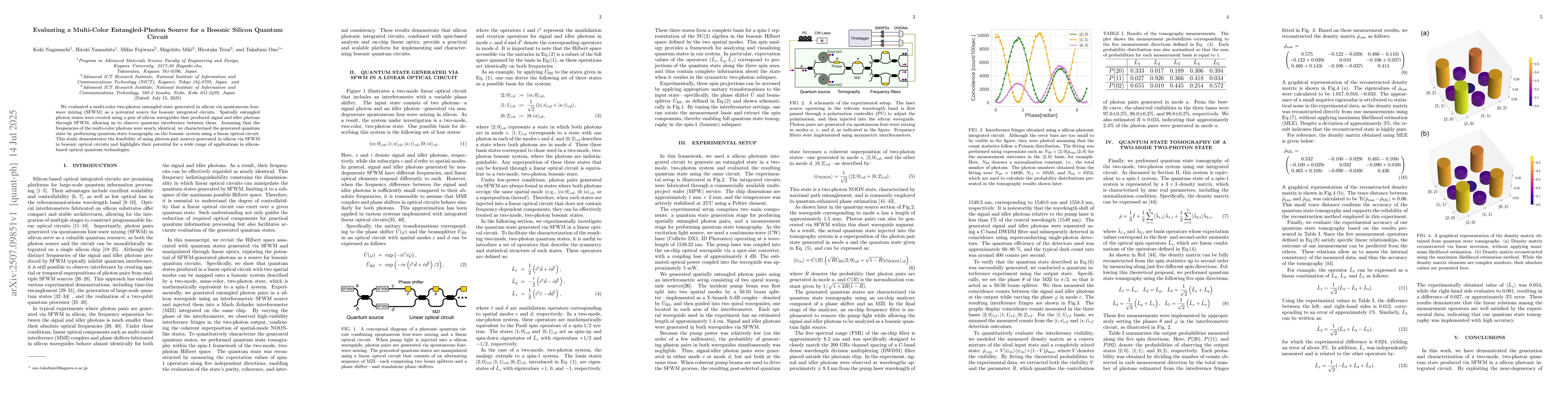 We evaluated a multi-color two-photon entangled state generated in silicon via spontaneous four-wave mixing (SFWM) as a potential source for bosonic integrated circuits. Spatially entangled photon states were created using a pair of silicon waveguides that produced signal and idler photons through SFWM, allowing us to observe quantum interference between them. Assuming that the frequencies of the multi-color photons were nearly identical, we characterized the generated quantum state by performing quantum state tomography on the bosonic system using a linear optical circuit. This study demonstrates the feasibility of using photon-pair sources generated in silicon via SFWM in bosonic optical circuits and highlights their potential for a wide range of applications in silicon-based optical quantum technologies.