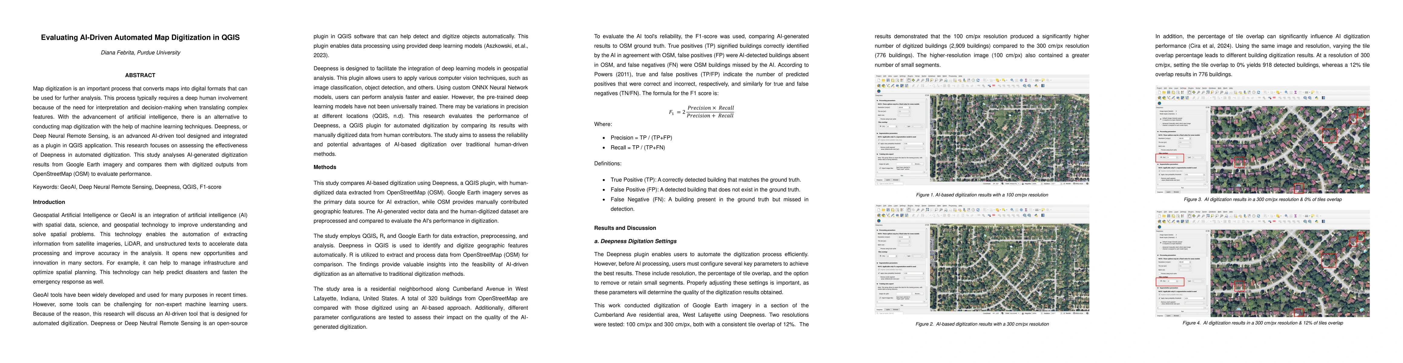 This work is novel in its focus on evaluating AI-driven digitization within the QGIS environment, specifically examining the influence of resolution and tile overlap on AI performance, which has not been extensively explored in previous research.
