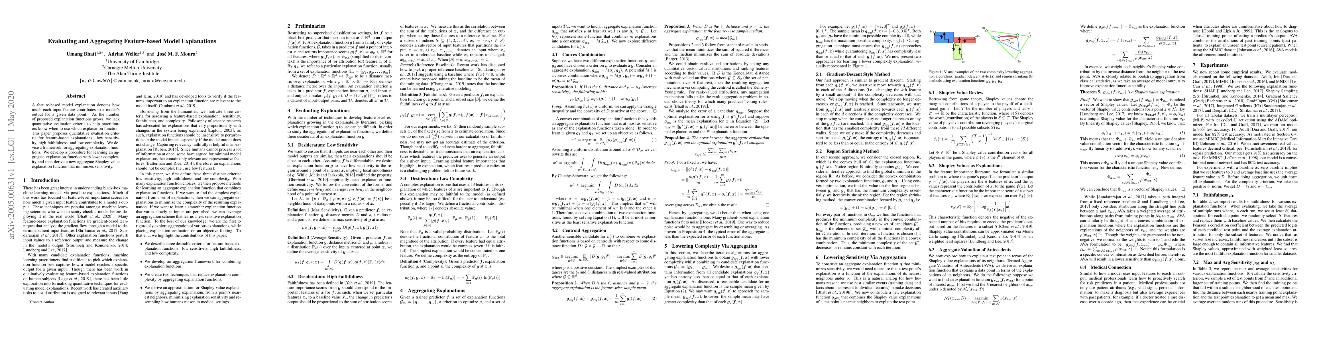 This paper introduces evaluation criteria for feature-based model explanations, proposing a framework for aggregating explanation functions to minimize sensitivity and complexity while maintaining faithfulness.