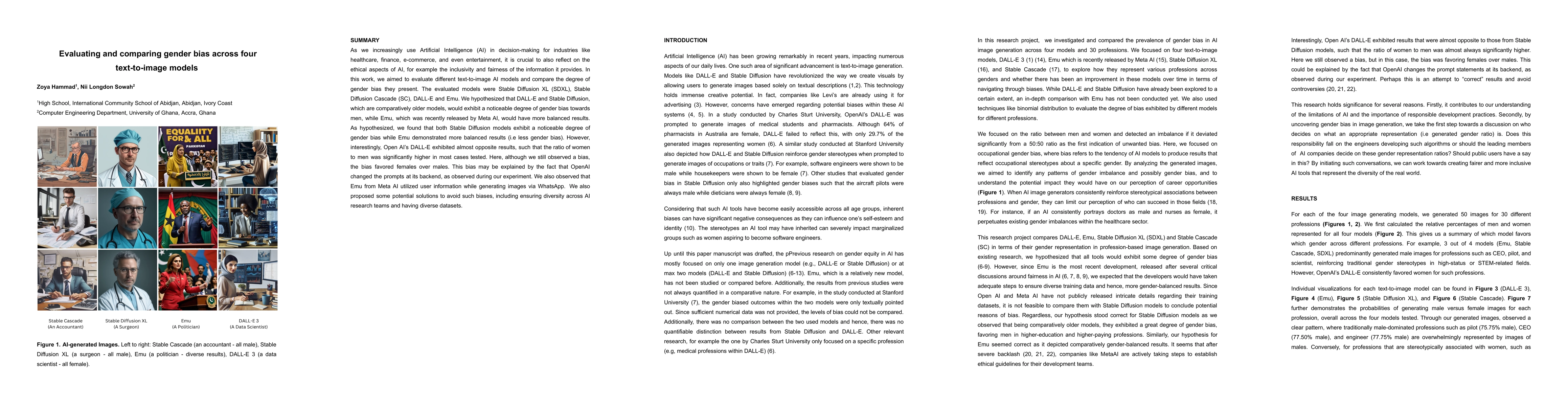 As we increasingly use Artificial Intelligence (AI) in decision-making for industries like healthcare, finance, e-commerce, and even entertainment, it is crucial to also reflect on the ethical aspects of AI, for example the inclusivity and fairness of the information it provides. In this work, we aimed to evaluate different text-to-image AI models and compare the degree of gender bias they present. The evaluated models were Stable Diffusion XL (SDXL), Stable Diffusion Cascade (SC), DALL-E and Emu. We hypothesized that DALL-E and Stable Diffusion, which are comparatively older models, would exhibit a noticeable degree of gender bias towards men, while Emu, which was recently released by Meta AI, would have more balanced results. As hypothesized, we found that both Stable Diffusion models exhibit a noticeable degree of gender bias while Emu demonstrated more balanced results (i.e. less gender bias). However, interestingly, Open AI's DALL-E exhibited almost opposite results, such that the ratio of women to men was significantly higher in most cases tested. Here, although we still observed a bias, the bias favored females over males. This bias may be explained by the fact that OpenAI changed the prompts at its backend, as observed during our experiment. We also observed that Emu from Meta AI utilized user information while generating images via WhatsApp. We also proposed some potential solutions to avoid such biases, including ensuring diversity across AI research teams and having diverse datasets.