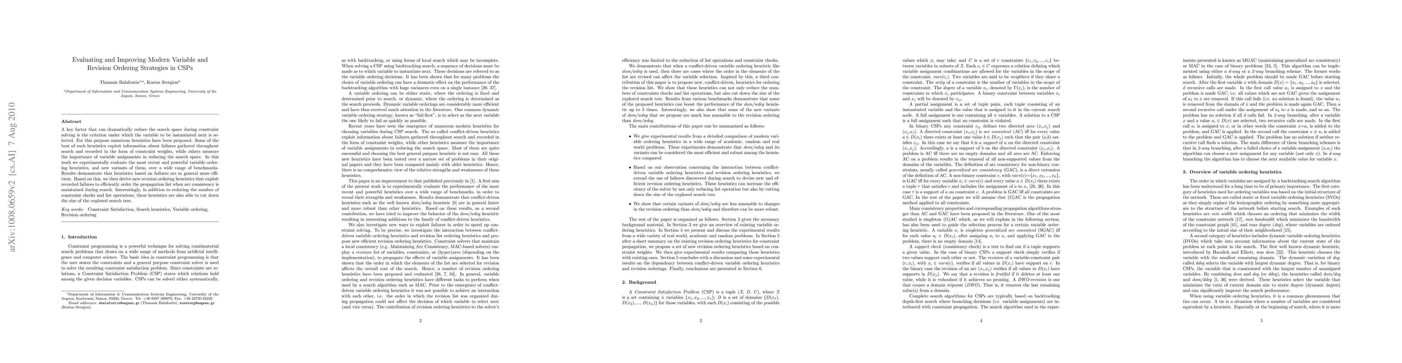 This paper evaluates and compares modern heuristics for variable and revision ordering in constraint satisfaction problems (CSPs), finding that failure-based heuristics are generally more efficient. It also proposes new revision ordering strategies that leverage recorded failures to reduce both constraint checks and the search tree size.