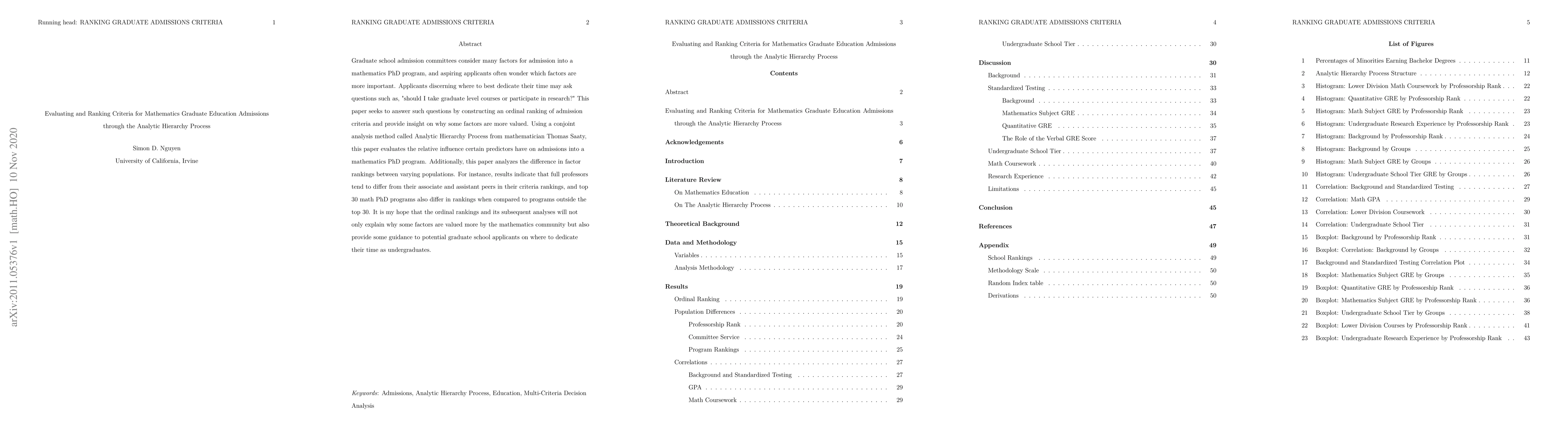 This paper uses the Analytic Hierarchy Process to rank criteria for mathematics PhD admissions, revealing differing priorities among full professors and between top 30 and other programs. It aims to guide applicants on where to focus their efforts based on these insights.
