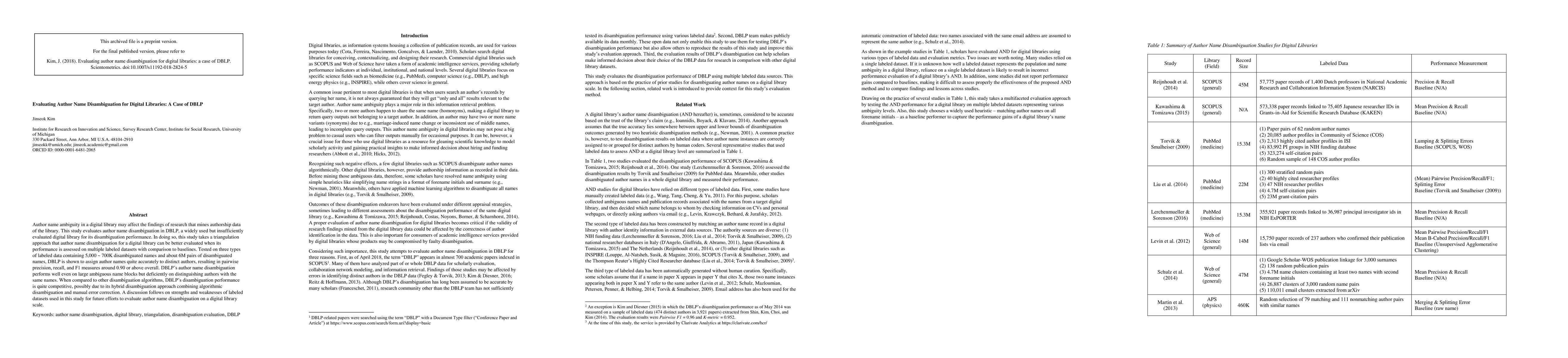 This study evaluates DBLP's author name disambiguation performance using a triangulation approach across multiple labeled datasets, finding DBLP's disambiguation accuracy to be high overall but less effective for names shared by multiple authors. DBLP's hybrid approach yields competitive results compared to other algorithms.