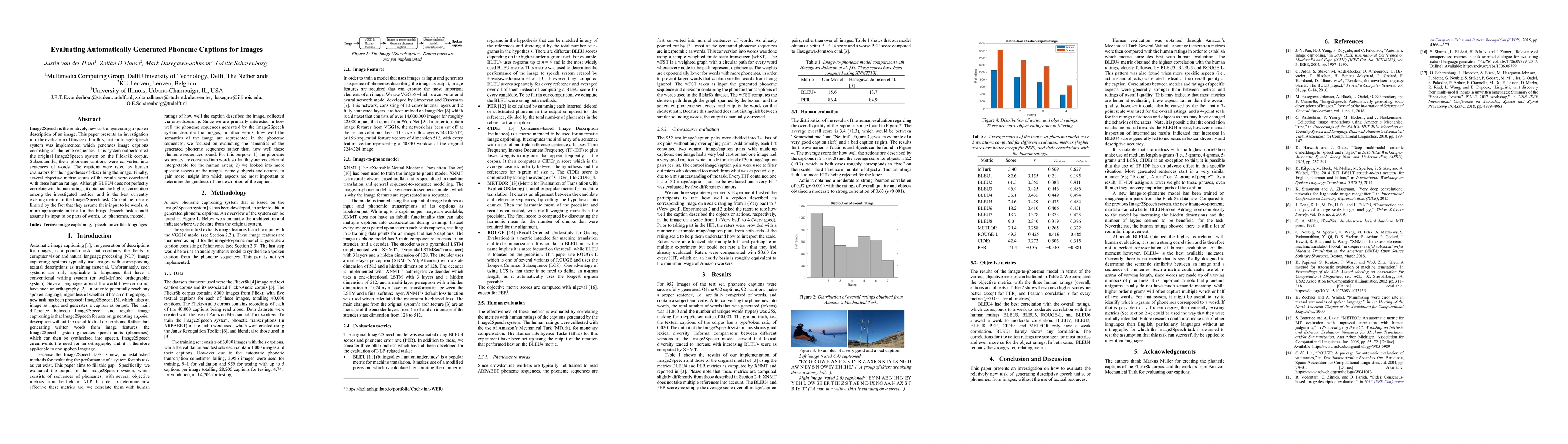 Researchers evaluated the effectiveness of automatically generated phoneme captions for images using BLEU4 metric, finding it to be the best correlation with human ratings, but suggesting a need for more accurate metrics that consider phonemes.