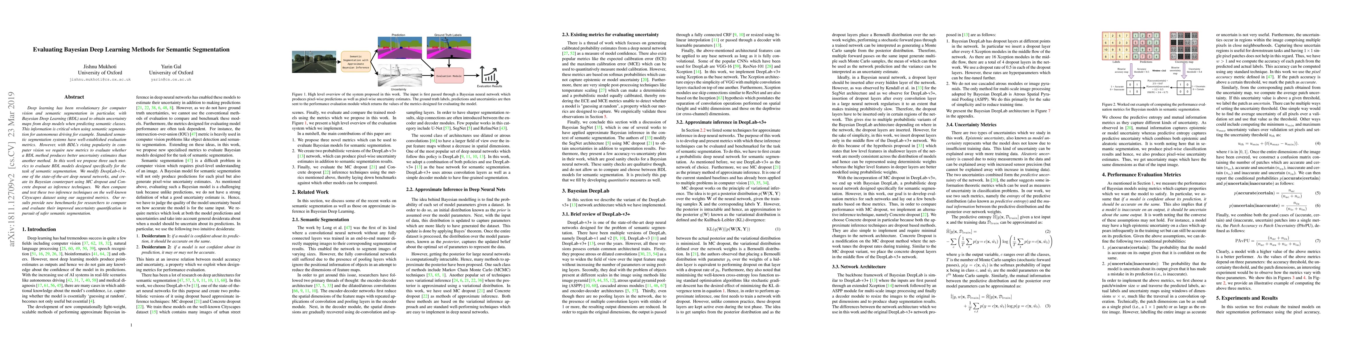 Deep learning has been revolutionary for computer vision and semantic segmentation in particular, with Bayesian Deep Learning (BDL) used to obtain uncertainty maps from deep models when predicting semantic classes. This information is critical when using semantic segmentation for autonomous driving for example. Standard semantic segmentation systems have well-established evaluation metrics. However, with BDL's rising popularity in computer vision we require new metrics to evaluate whether a BDL method produces better uncertainty estimates than another method. In this work we propose three such metrics to evaluate BDL models designed specifically for the task of semantic segmentation. We modify DeepLab-v3+, one of the state-of-the-art deep neural networks, and create its Bayesian counterpart using MC dropout and Concrete dropout as inference techniques. We then compare and test these two inference techniques on the well-known Cityscapes dataset using our suggested metrics. Our results provide new benchmarks for researchers to compare and evaluate their improved uncertainty quantification in pursuit of safer semantic segmentation.