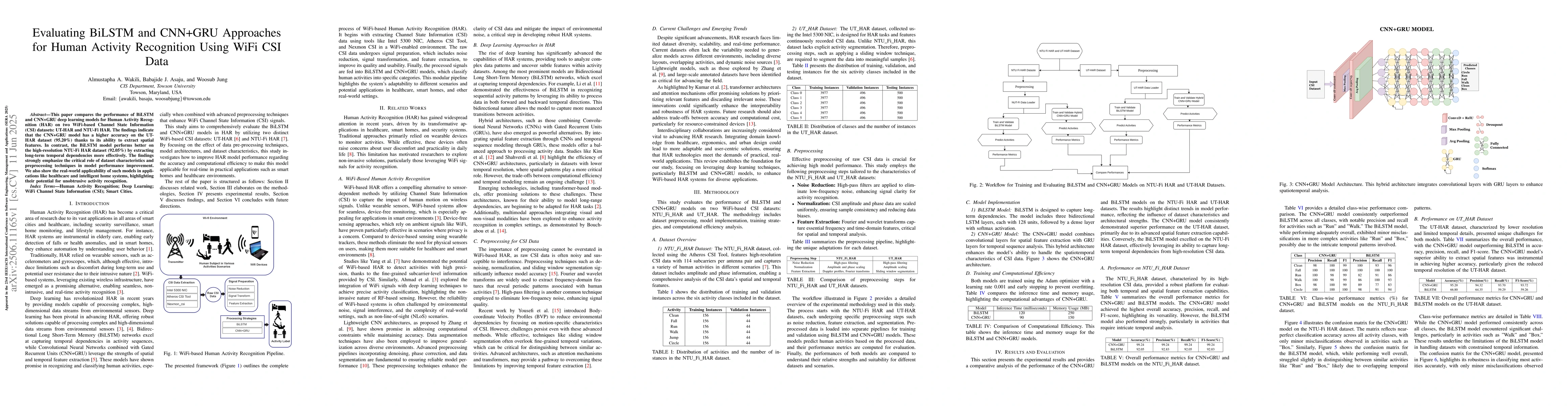This paper compares the performance of BiLSTM and CNN+GRU deep learning models for Human Activity Recognition (HAR) on two WiFi-based Channel State Information (CSI) datasets: UT-HAR and NTU-Fi HAR. The findings indicate that the CNN+GRU model has a higher accuracy on the UT-HAR dataset (95.20%) thanks to its ability to extract spatial features. In contrast, the BiLSTM model performs better on the high-resolution NTU-Fi HAR dataset (92.05%) by extracting long-term temporal dependencies more effectively. The findings strongly emphasize the critical role of dataset characteristics and preprocessing techniques in model performance improvement. We also show the real-world applicability of such models in applications like healthcare and intelligent home systems, highlighting their potential for unobtrusive activity recognition.