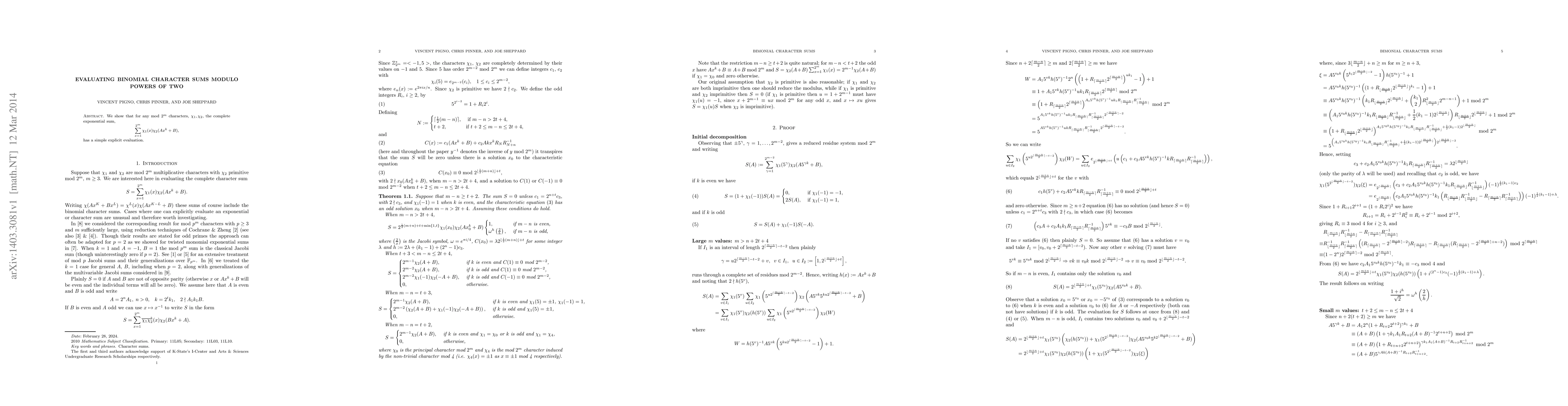 We show that for any mod $2^m$ characters, $\chi_1, \chi_2,$ the complete exponential sum, $$ \sum_{x=1}^{2^m}\chi_1(x) \chi_2(Ax^k+B), $$ has a simple explicit evaluation.