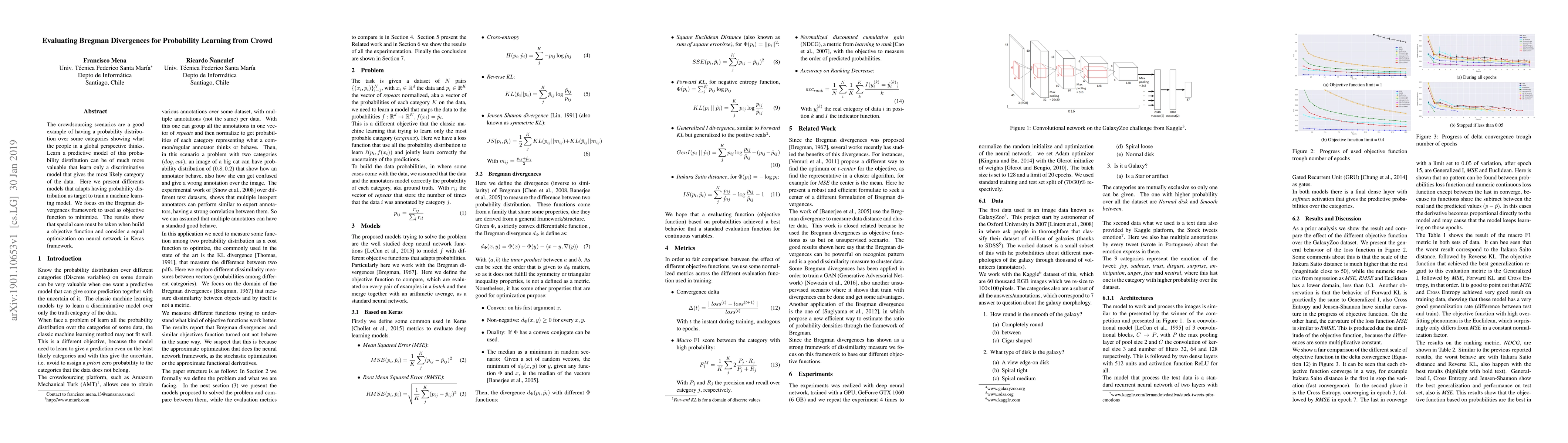 The crowdsourcing scenarios are a good example of having a probability distribution over some categories showing what the people in a global perspective thinks. Learn a predictive model of this probability distribution can be of much more valuable that learn only a discriminative model that gives the most likely category of the data. Here we present differents models that adapts having probability distribution as target to train a machine learning model. We focus on the Bregman divergences framework to used as objective function to minimize. The results show that special care must be taken when build a objective function and consider a equal optimization on neural network in Keras framework.