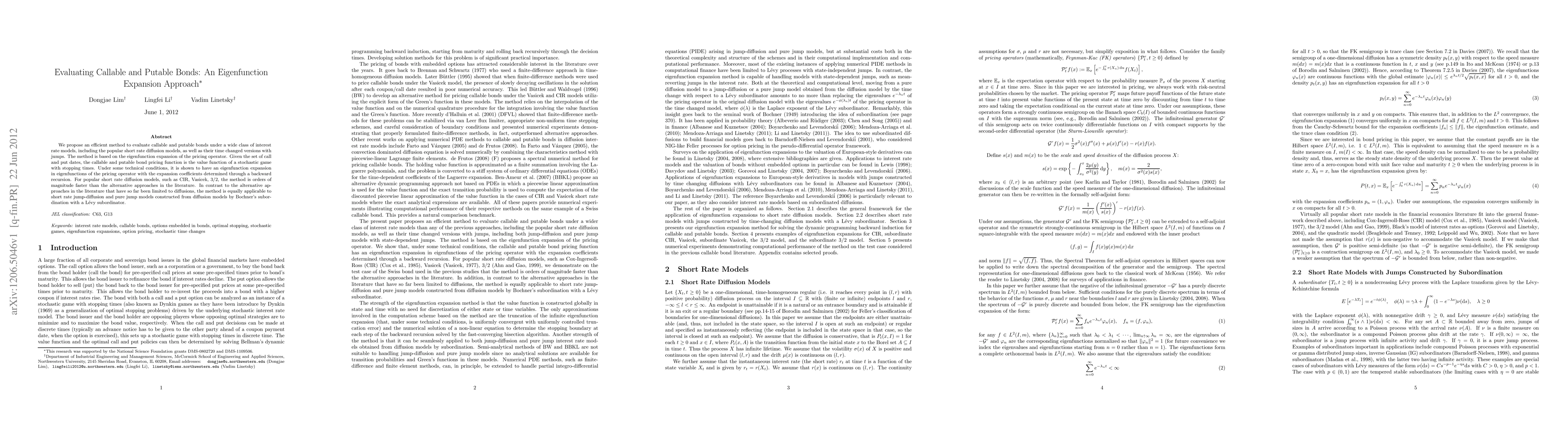 This paper proposes an efficient eigenfunction expansion method for evaluating callable and putable bonds across various interest rate models, including diffusion and jump-diffusion models. The method is significantly faster than existing alternatives and can handle a broader range of models beyond traditional diffusion models.