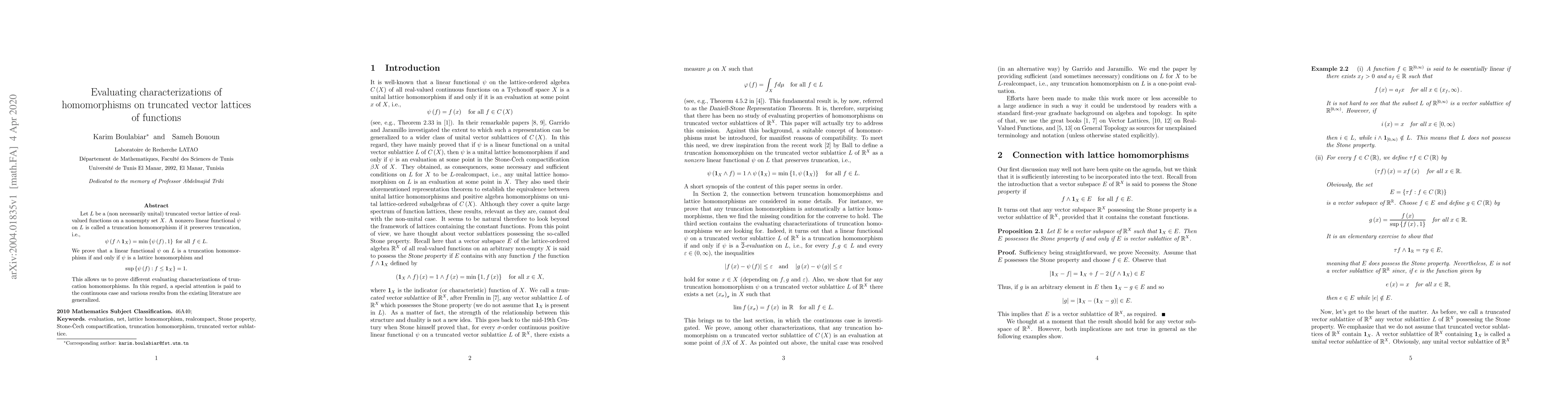 Let $L$ be a (non necessarily unital) truncated vector lattice of real-valued functions on a nonempty set $X$. A nonzero linear functional $\psi$ on $L$ is called a truncation homomorphism if it preserves truncation, i.e.,% \[ \psi\left( f\wedge\mathbf{1}_{X}\right) =\min\left\{ \psi\left( f\right) ,1\right\} \text{ for all }f\in L. \] We prove that a linear functional $\psi$ on $L$ is a truncation homomorphism if and only if $\psi$ is a lattice homomorphism and% \[ \sup\left\{ \psi\left( f\right) :f\leq\mathbf{1}_{X}\right\} =1. \] This allows us to prove different evaluating characterizations of truncation homomorphisms. In this regard, a special attention is paid to the continuous case and various results from the existing literature are generalized.