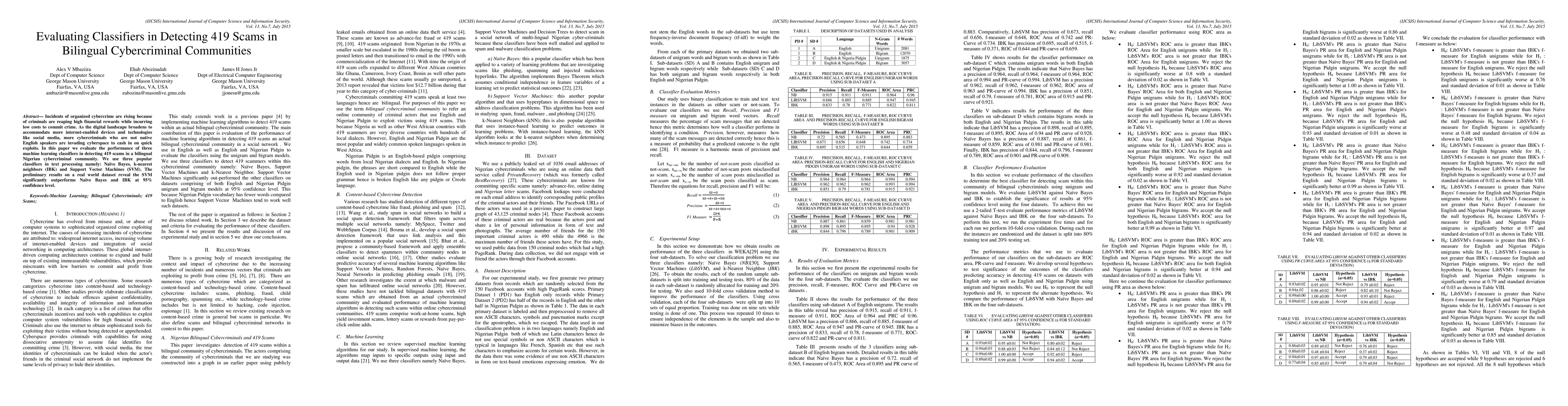 This paper evaluates the performance of three machine learning classifiers—Naive Bayes, k-nearest neighbors (IBK), and Support Vector Machines (SVM)—in detecting 419 scams within a bilingual Nigerian cybercriminal community. The results show that SVM significantly outperforms the other classifiers at a 95% confidence level.
