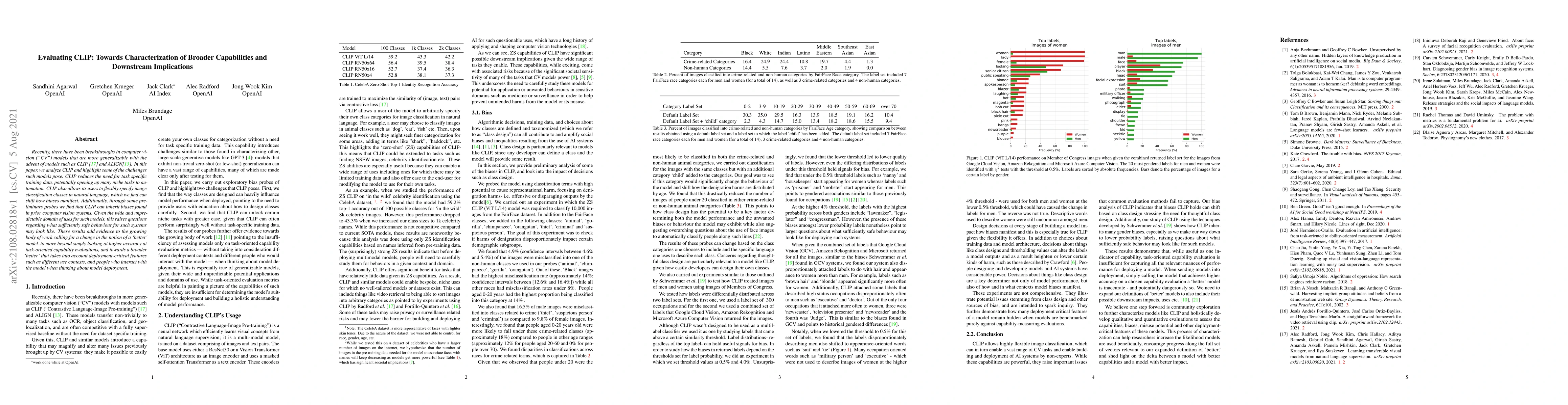 Recently, there have been breakthroughs in computer vision ("CV") models that are more generalizable with the advent of models such as CLIP and ALIGN. In this paper, we analyze CLIP and highlight some of the challenges such models pose. CLIP reduces the need for task specific training data, potentially opening up many niche tasks to automation. CLIP also allows its users to flexibly specify image classification classes in natural language, which we find can shift how biases manifest. Additionally, through some preliminary probes we find that CLIP can inherit biases found in prior computer vision systems. Given the wide and unpredictable domain of uses for such models, this raises questions regarding what sufficiently safe behaviour for such systems may look like. These results add evidence to the growing body of work calling for a change in the notion of a 'better' model--to move beyond simply looking at higher accuracy at task-oriented capability evaluations, and towards a broader 'better' that takes into account deployment-critical features such as different use contexts, and people who interact with the model when thinking about model deployment.
