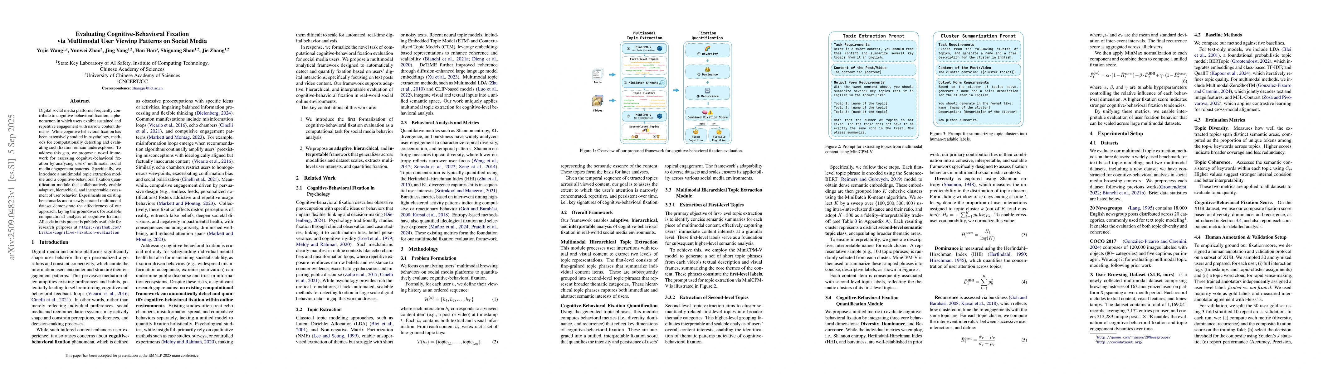Digital social media platforms frequently contribute to cognitive-behavioral fixation, a phenomenon in which users exhibit sustained and repetitive engagement with narrow content domains. While cognitive-behavioral fixation has been extensively studied in psychology, methods for computationally detecting and evaluating such fixation remain underexplored. To address this gap, we propose a novel framework for assessing cognitive-behavioral fixation by analyzing users' multimodal social media engagement patterns. Specifically, we introduce a multimodal topic extraction module and a cognitive-behavioral fixation quantification module that collaboratively enable adaptive, hierarchical, and interpretable assessment of user behavior. Experiments on existing benchmarks and a newly curated multimodal dataset demonstrate the effectiveness of our approach, laying the groundwork for scalable computational analysis of cognitive fixation. All code in this project is publicly available for research purposes at https://github.com/Liskie/cognitive-fixation-evaluation.