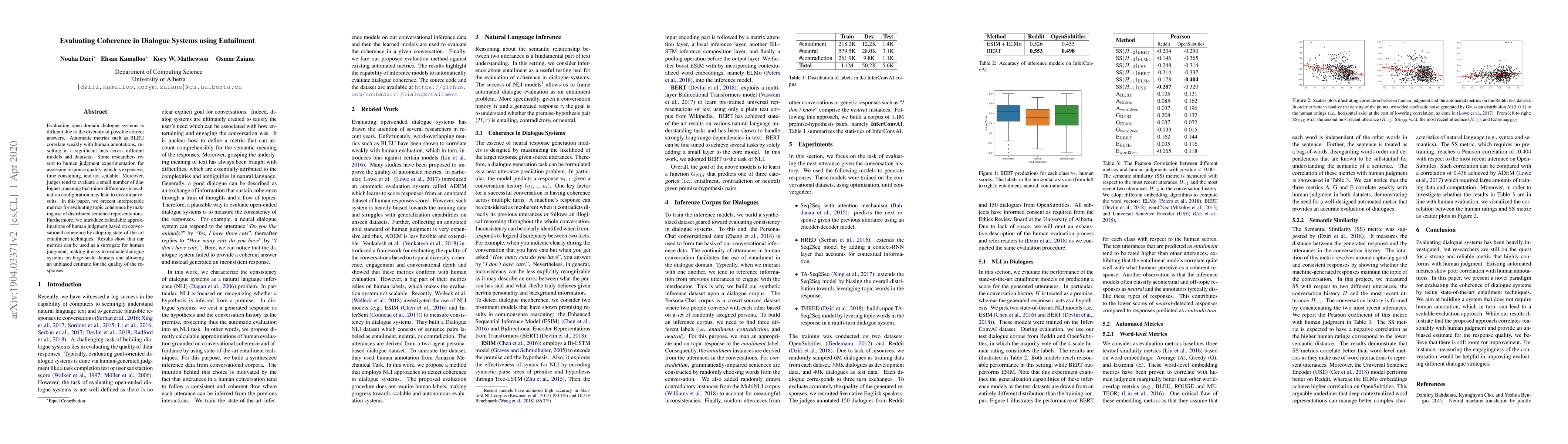 This paper proposes interpretable metrics for evaluating the coherence of responses in open-domain dialogue systems, utilizing distributed sentence representations and state-of-the-art entailment techniques. The introduced metrics serve as a scalable and unbiased alternative to human judgment, facilitating large-scale evaluation of dialogue systems.