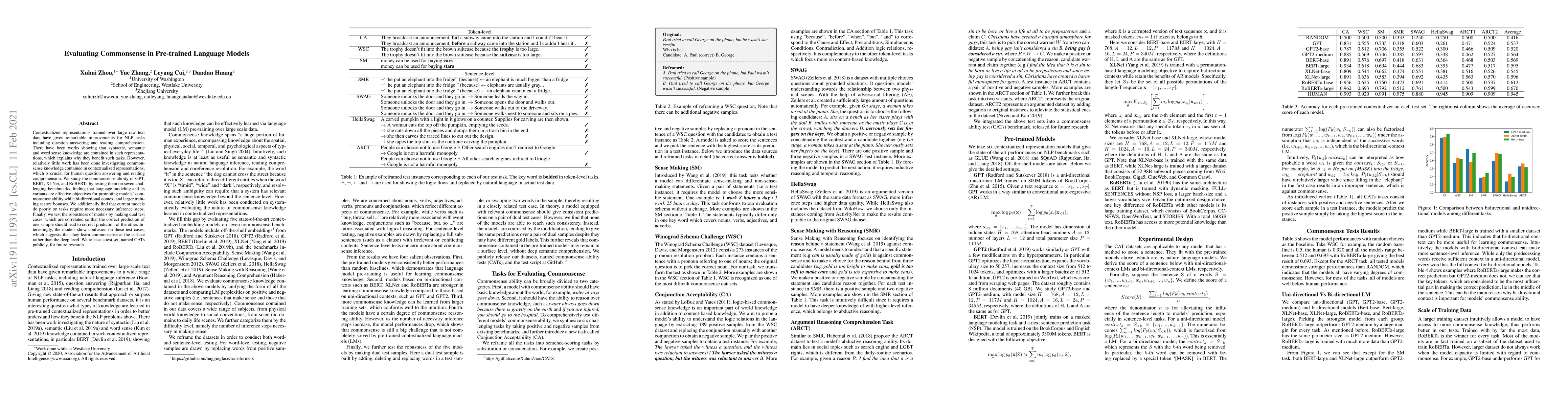 Researchers tested 4 popular language models on common sense tasks, finding that training with a larger dataset and bi-directional context improves their performance, but they struggle with deeper-level inferences. The study also highlights the importance of releasing public test data for future research.