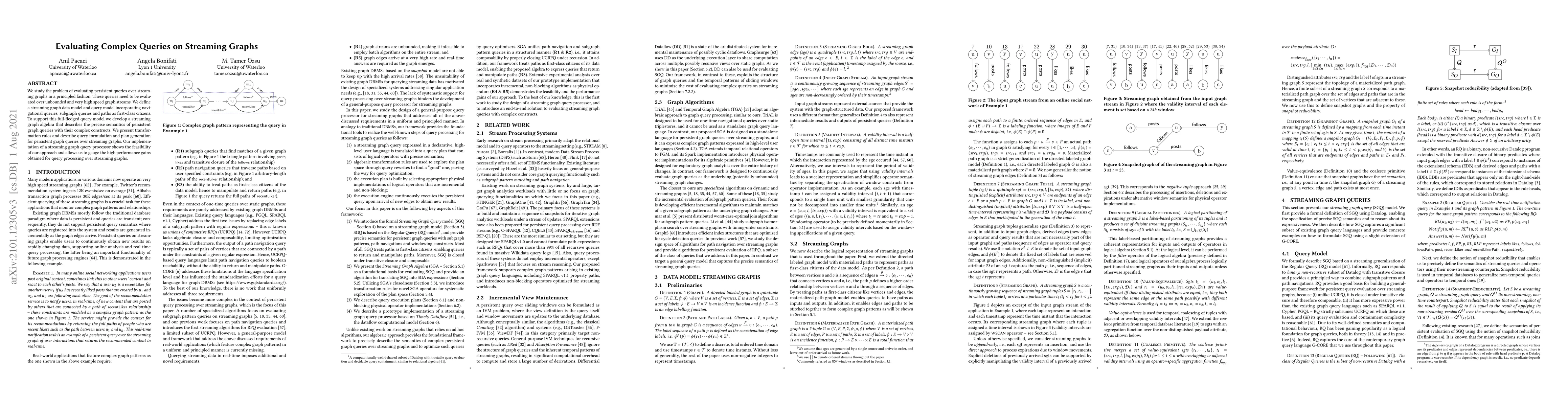 This paper proposes a streaming graph data model and query model for evaluating persistent queries over high-speed graph streams, introducing a streaming graph algebra to define query semantics and presenting transformation rules for query processing. The implementation demonstrates significant performance gains for query processing in streaming graph environments.