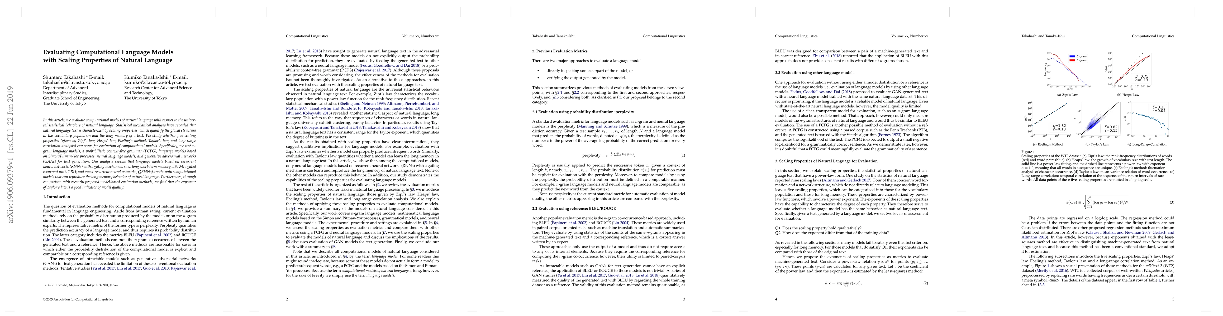 In this article, we evaluate computational models of natural language with respect to the universal statistical behaviors of natural language. Statistical mechanical analyses have revealed that natural language text is characterized by scaling properties, which quantify the global structure in the vocabulary population and the long memory of a text. We study whether five scaling properties (given by Zipf's law, Heaps' law, Ebeling's method, Taylor's law, and long-range correlation analysis) can serve for evaluation of computational models. Specifically, we test $n$-gram language models, a probabilistic context-free grammar (PCFG), language models based on Simon/Pitman-Yor processes, neural language models, and generative adversarial networks (GANs) for text generation. Our analysis reveals that language models based on recurrent neural networks (RNNs) with a gating mechanism (i.e., long short-term memory, LSTM; a gated recurrent unit, GRU; and quasi-recurrent neural networks, QRNNs) are the only computational models that can reproduce the long memory behavior of natural language. Furthermore, through comparison with recently proposed model-based evaluation methods, we find that the exponent of Taylor's law is a good indicator of model quality.