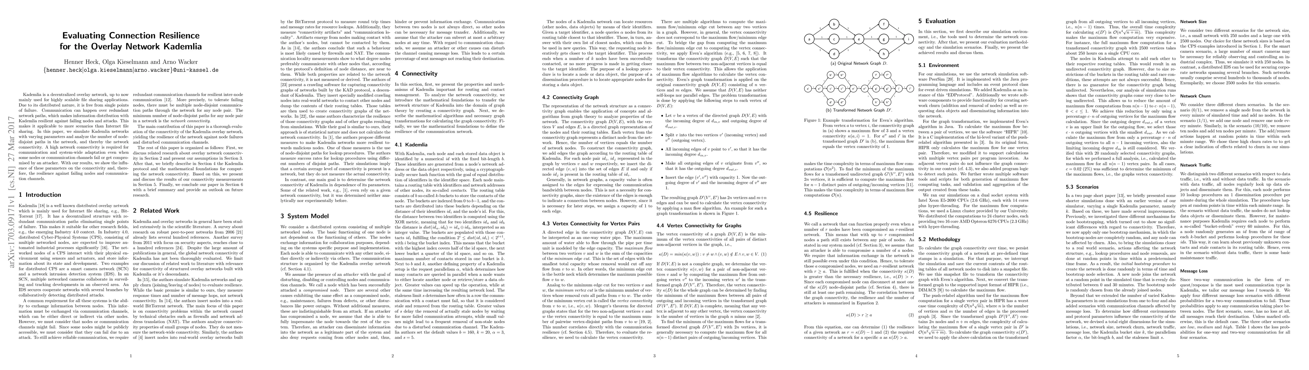 Kademlia is a decentralized overlay network, up to now mainly used for highly scalable file sharing applications. Due to its distributed nature, it is free from single points of failure. Communication can happen over redundant network paths, which makes information distribution with Kademlia resilient against failing nodes and attacks. This makes it applicable to more scenarios than Internet file sharing. In this paper, we simulate Kademlia networks with varying parameters and analyze the number of node-disjoint paths in the network, and thereby the network connectivity. A high network connectivity is required for communication and system-wide adaptation even when some nodes or communication channels fail or get compromised by an attacker. With our results, we show the influence of these parameters on the connectivity and, therefore, the resilience against failing nodes and communication channels.