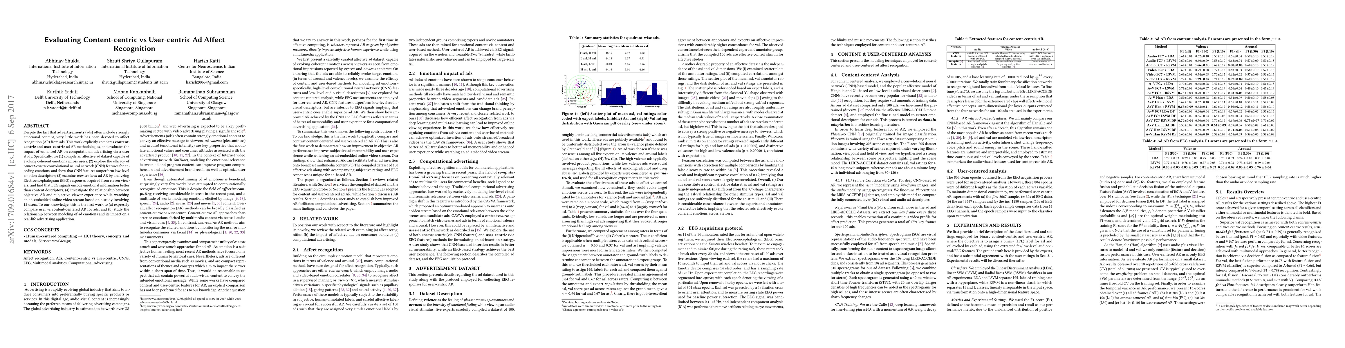 This research paper compares content-centric and user-centric methodologies for affect recognition in advertisements, finding that user-centered approaches, particularly EEG responses, better encode emotional information than content-centric CNN features. The study also investigates the relationship between objective emotion recognition and viewers' subjective experiences during ad-embedded video streams. For more details, the original paper should be consulted directly.