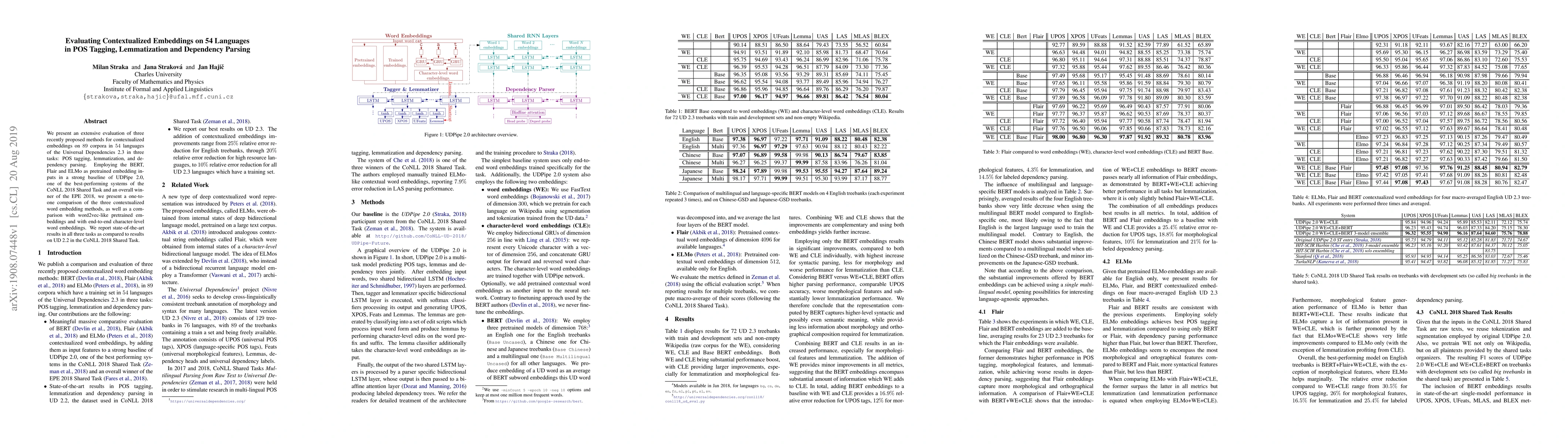 This paper evaluates the performance of BERT, Flair, and ELMo contextualized embeddings on 89 corpora in 54 languages across POS tagging, lemmatization, and dependency parsing tasks. The study reports state-of-the-art results using UDPipe 2.0, showing significant improvements over previous word2vec-like and character-level models.