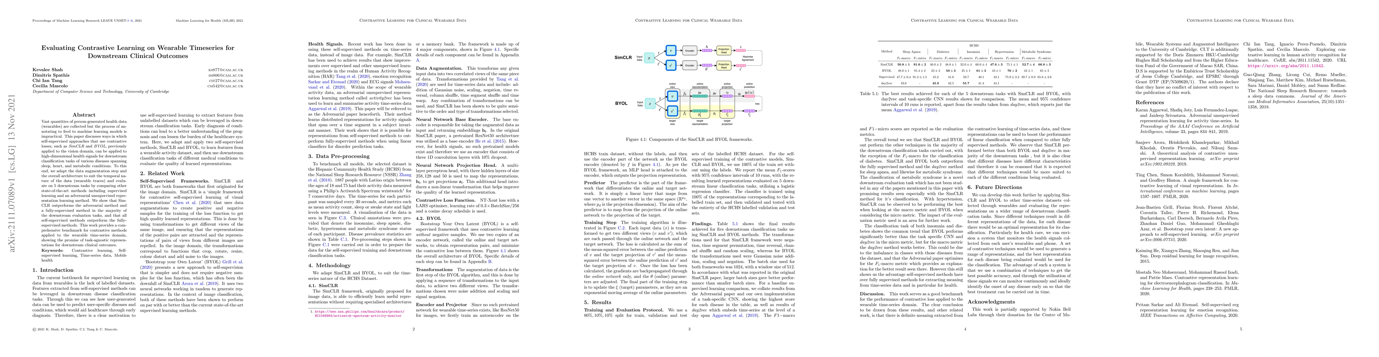 This paper explores the application of contrastive learning methods like SimCLR and BYOL to wearable time-series data for various clinical outcomes, demonstrating that self-supervised approaches outperform fully-supervised methods in downstream classification tasks. The study establishes a benchmark for using contrastive learning in the domain of health signals.