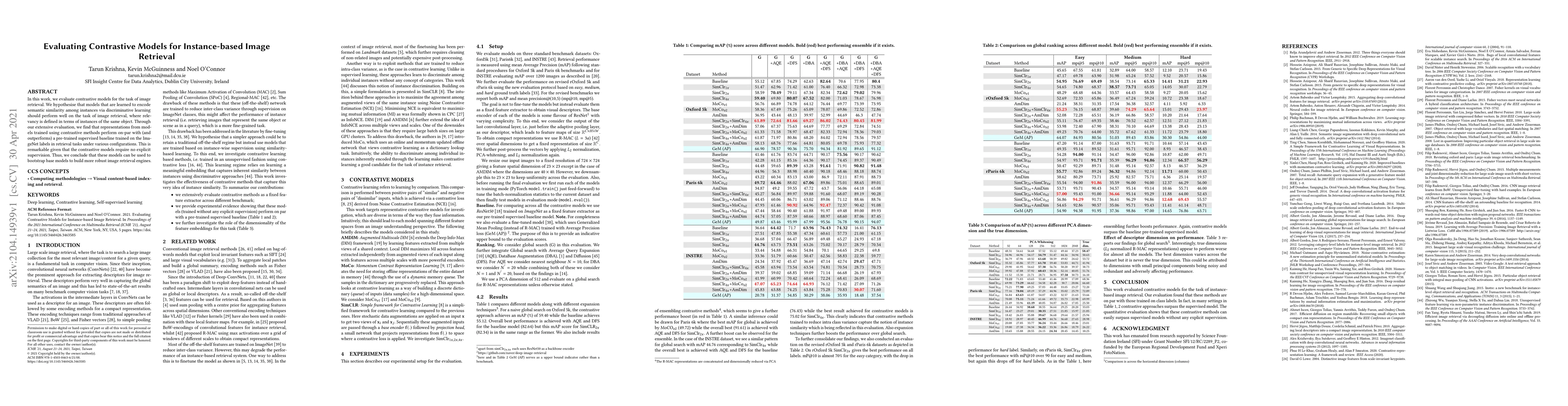 This paper evaluates contrastive models for instance-based image retrieval, finding that they perform competitively with supervised baselines despite requiring no explicit supervision. The results suggest that contrastive learning can effectively bootstrap base models for robust image retrieval systems.