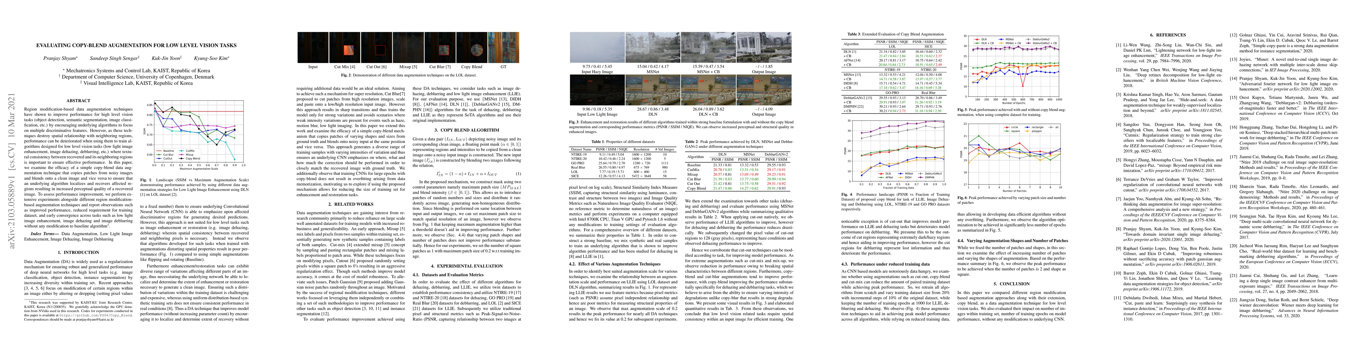 This paper evaluates the COPY-BLEND augmentation technique for low level vision tasks, demonstrating improved performance, reduced training dataset needs, and early convergence in tasks like low light enhancement, dehazing, and deblurring without altering the baseline algorithm.