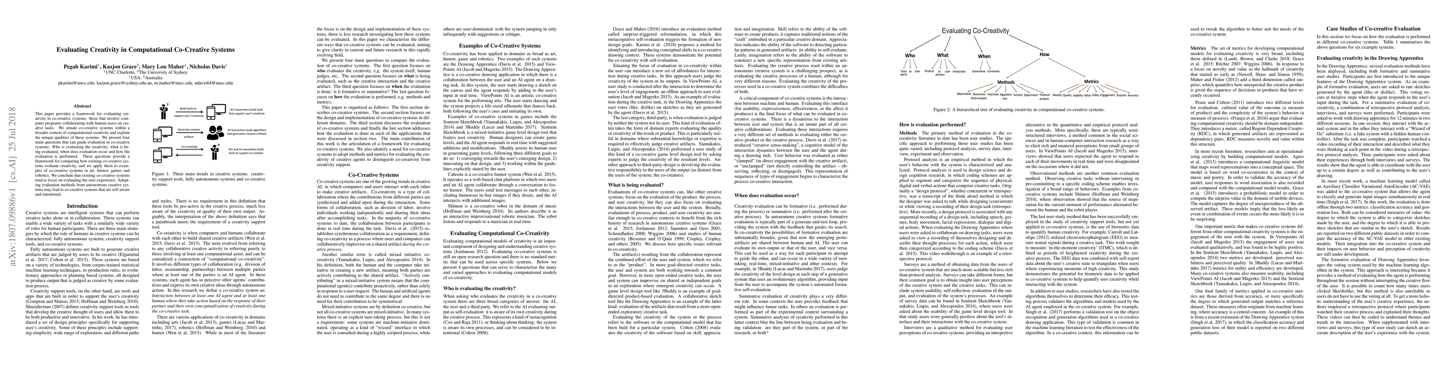This paper proposes a framework to evaluate creativity in co-creative systems, which involve human-computer collaboration on creative tasks, focusing on four key questions: the evaluator, the evaluated, timing, and methodology. It suggests that existing systems often focus on user experience, and recommends adopting methods from autonomous creative systems to develop self-aware co-creative systems.