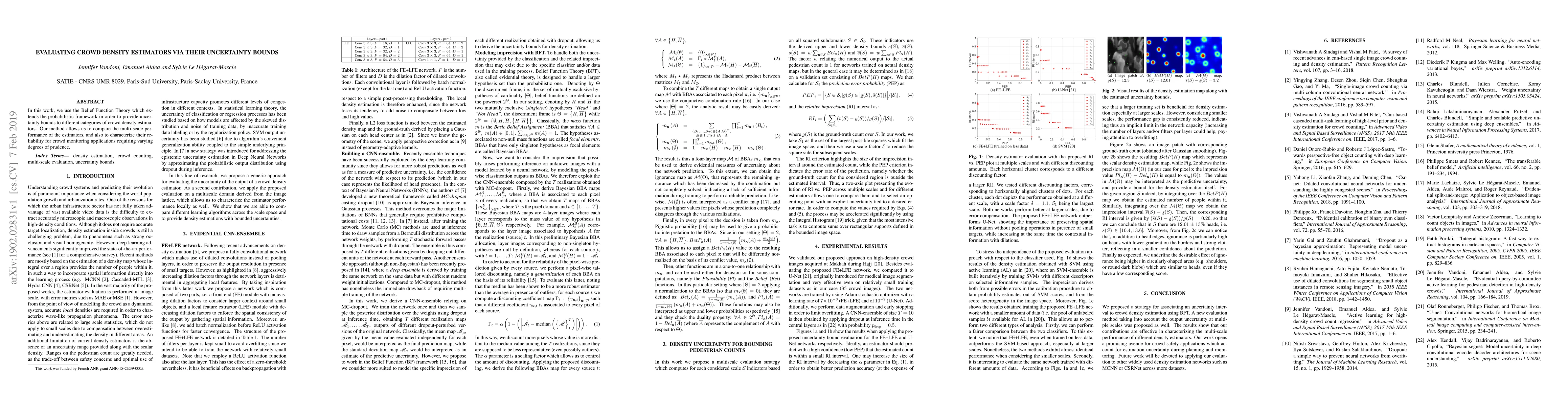 In this work, we use the Belief Function Theory which extends the probabilistic framework in order to provide uncertainty bounds to different categories of crowd density estimators. Our method allows us to compare the multi-scale performance of the estimators, and also to characterize their reliability for crowd monitoring applications requiring varying degrees of prudence.