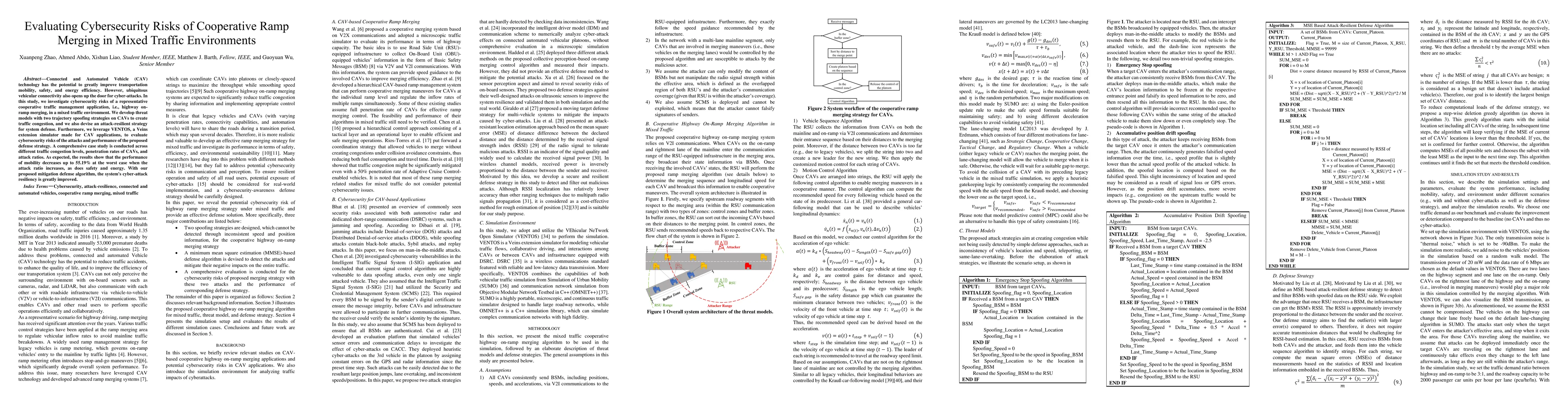 This study evaluates cybersecurity risks in cooperative ramp merging for Connected and Automated Vehicles (CAVs) in mixed traffic environments, identifying threats from trajectory spoofing attacks and developing an attack-resilient defense strategy. Results show significant declines in mobility, safety, and energy efficiency under attack, which are mitigated by the proposed defense algorithm.