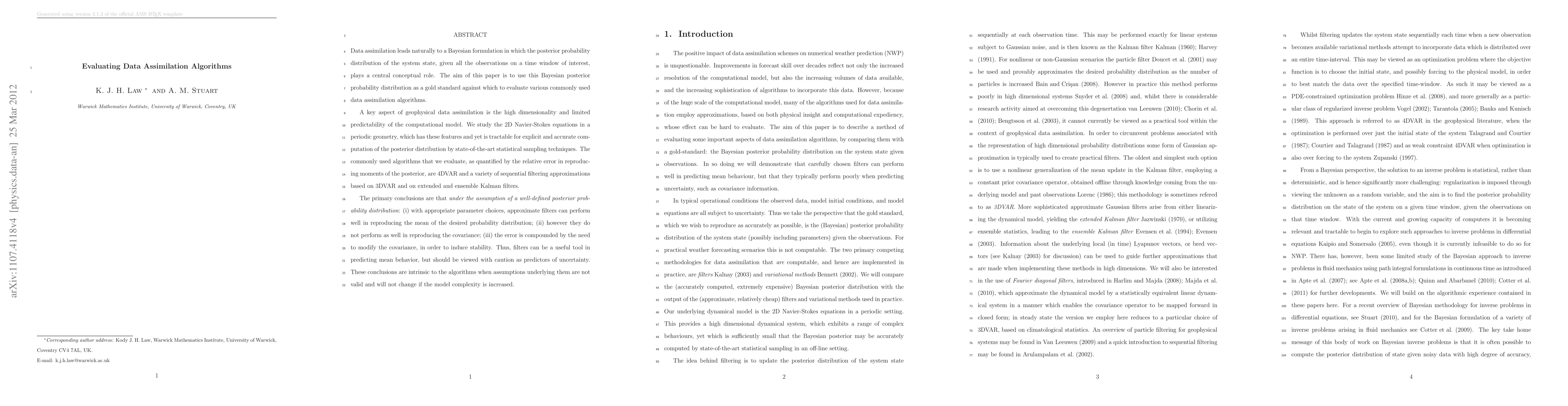 Data assimilation leads naturally to a Bayesian formulation in which the posterior probability distribution of the system state, given the observations, plays a central conceptual role. The aim of this paper is to use this Bayesian posterior probability distribution as a gold standard against which to evaluate various commonly used data assimilation algorithms. A key aspect of geophysical data assimilation is the high dimensionality and low predictability of the computational model. With this in mind, yet with the goal of allowing an explicit and accurate computation of the posterior distribution, we study the 2D Navier-Stokes equations in a periodic geometry. We compute the posterior probability distribution by state-of-the-art statistical sampling techniques. The commonly used algorithms that we evaluate against this accurate gold standard, as quantified by comparing the relative error in reproducing its moments, are 4DVAR and a variety of sequential filtering approximations based on 3DVAR and on extended and ensemble Kalman filters. The primary conclusions are that: (i) with appropriate parameter choices, approximate filters can perform well in reproducing the mean of the desired probability distribution; (ii) however they typically perform poorly when attempting to reproduce the covariance; (iii) this poor performance is compounded by the need to modify the covariance, in order to induce stability. Thus, whilst filters can be a useful tool in predicting mean behavior, they should be viewed with caution as predictors of uncertainty. These conclusions are intrinsic to the algorithms and will not change if the model complexity is increased, for example by employing a smaller viscosity, or by using a detailed NWP model.