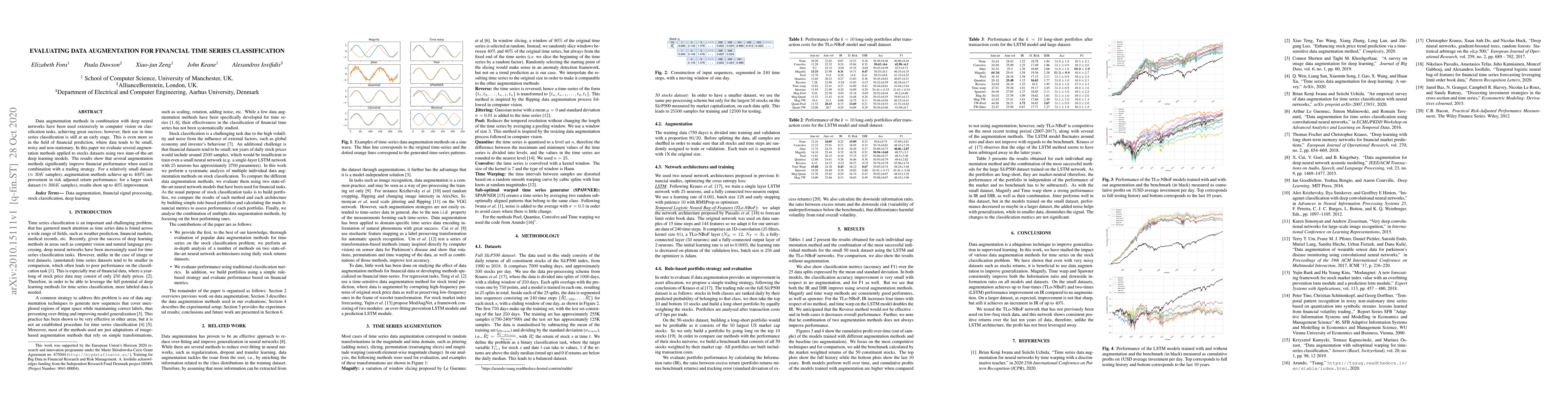 Data augmentation methods in combination with deep neural networks have been used extensively in computer vision on classification tasks, achieving great success; however, their use in time series classification is still at an early stage. This is even more so in the field of financial prediction, where data tends to be small, noisy and non-stationary. In this paper we evaluate several augmentation methods applied to stocks datasets using two state-of-the-art deep learning models. The results show that several augmentation methods significantly improve financial performance when used in combination with a trading strategy. For a relatively small dataset ($\approx30K$ samples), augmentation methods achieve up to $400\%$ improvement in risk adjusted return performance; for a larger stock dataset ($\approx300K$ samples), results show up to $40\%$ improvement.