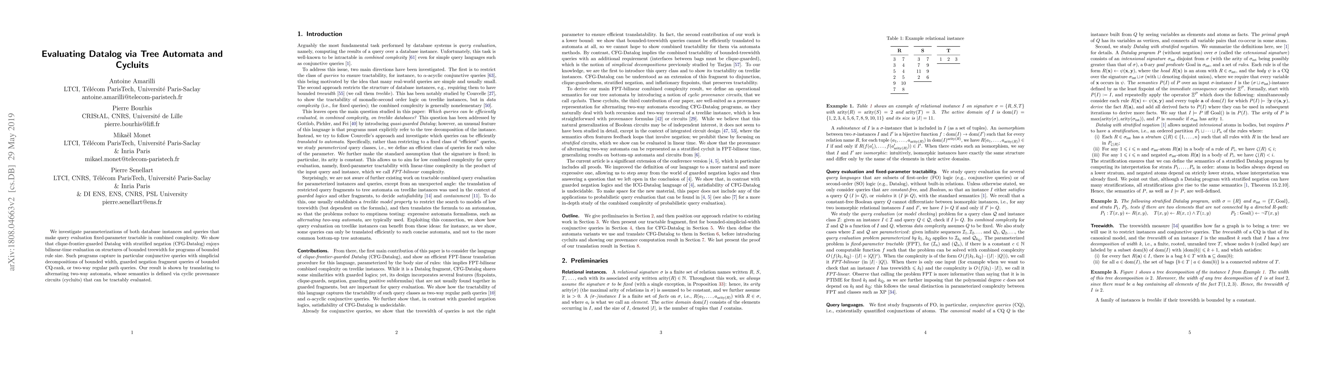 We investigate parameterizations of both database instances and queries that make query evaluation fixed-parameter tractable in combined complexity. We show that clique-frontier-guarded Datalog with stratified negation (CFG-Datalog) enjoys bilinear-time evaluation on structures of bounded treewidth for programs of bounded rule size. Such programs capture in particular conjunctive queries with simplicial decompositions of bounded width, guarded negation fragment queries of bounded CQ-rank, or two-way regular path queries. Our result is shown by translating to alternating two-way automata, whose semantics is defined via cyclic provenance circuits (cycluits) that can be tractably evaluated.