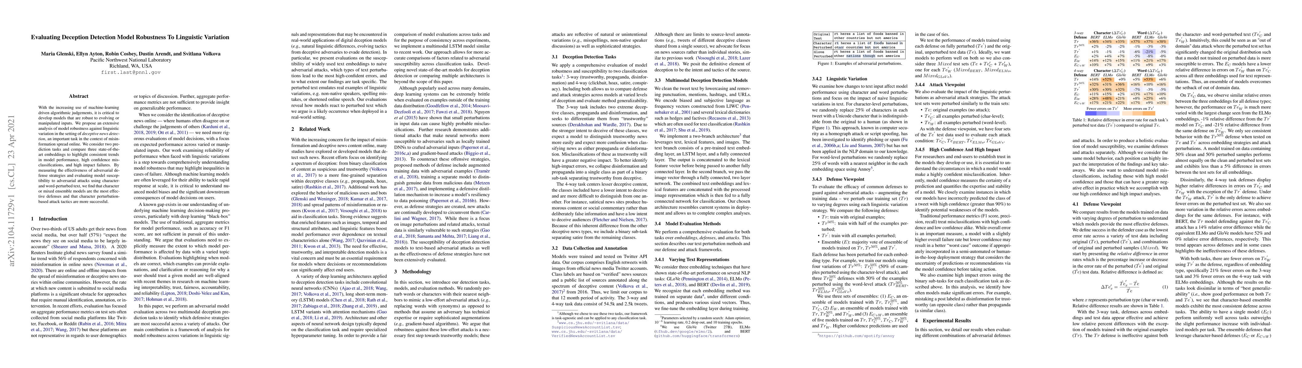 A study evaluates the robustness of deception detection models to linguistic variation in online news, finding that character-based models are most effective defenses against adversarial attacks.