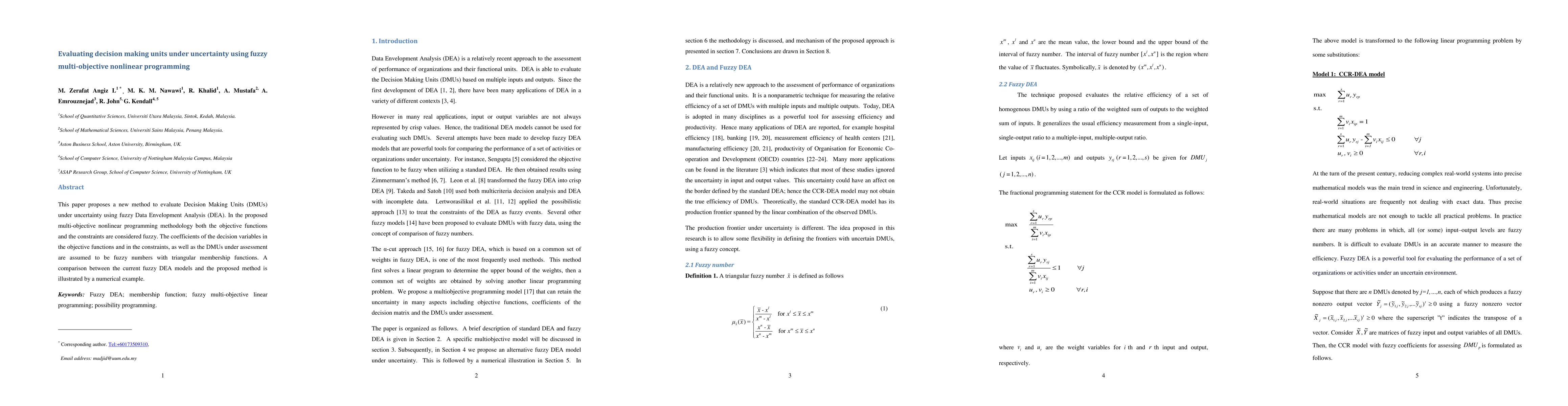 This paper proposes a new method to evaluate Decision Making Units (DMUs) under uncertainty using fuzzy Data Envelopment Analysis (DEA). In the proposed multi-objective nonlinear programming methodology both the objective functions and the constraints are considered fuzzy. The coefficients of the decision variables in the objective functions and in the constraints, as well as the DMUs under assessment are assumed to be fuzzy numbers with triangular membership functions. A comparison between the current fuzzy DEA models and the proposed method is illustrated by a numerical example.