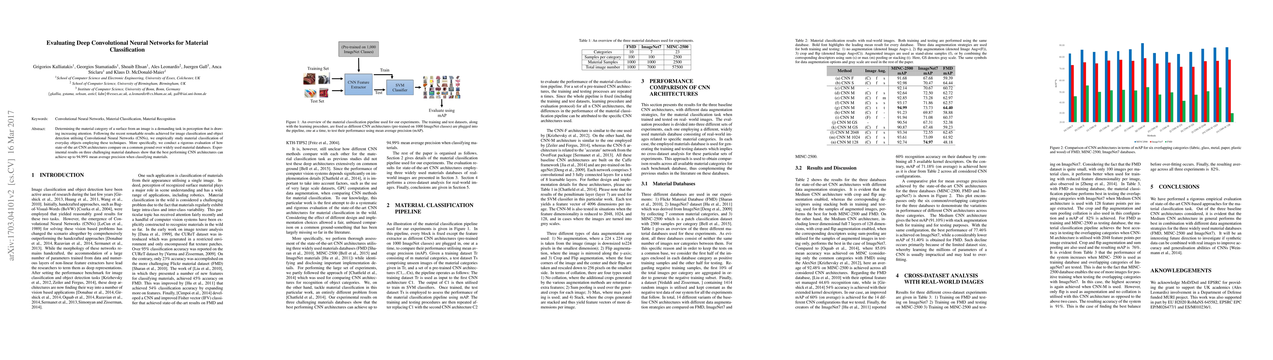 Determining the material category of a surface from an image is a demanding task in perception that is drawing increasing attention. Following the recent remarkable results achieved for image classification and object detection utilising Convolutional Neural Networks (CNNs), we empirically study material classification of everyday objects employing these techniques. More specifically, we conduct a rigorous evaluation of how state-of-the art CNN architectures compare on a common ground over widely used material databases. Experimental results on three challenging material databases show that the best performing CNN architectures can achieve up to 94.99\% mean average precision when classifying materials.