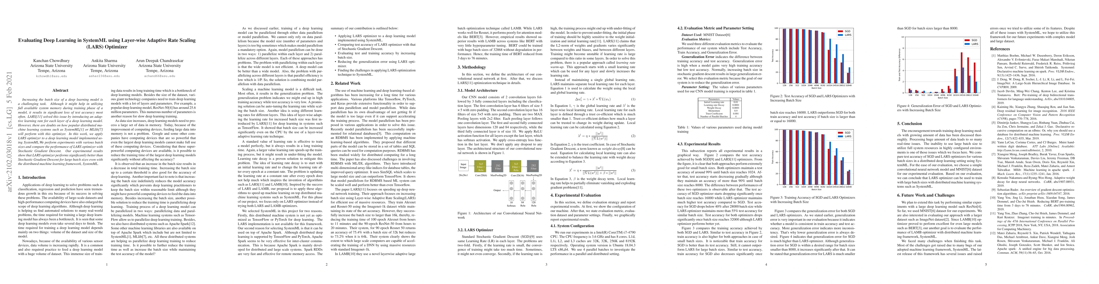 The paper presents an application of LARS optimizer in a distributed machine learning system, SystemML, and compares its performance against Stochastic Gradient Descent.