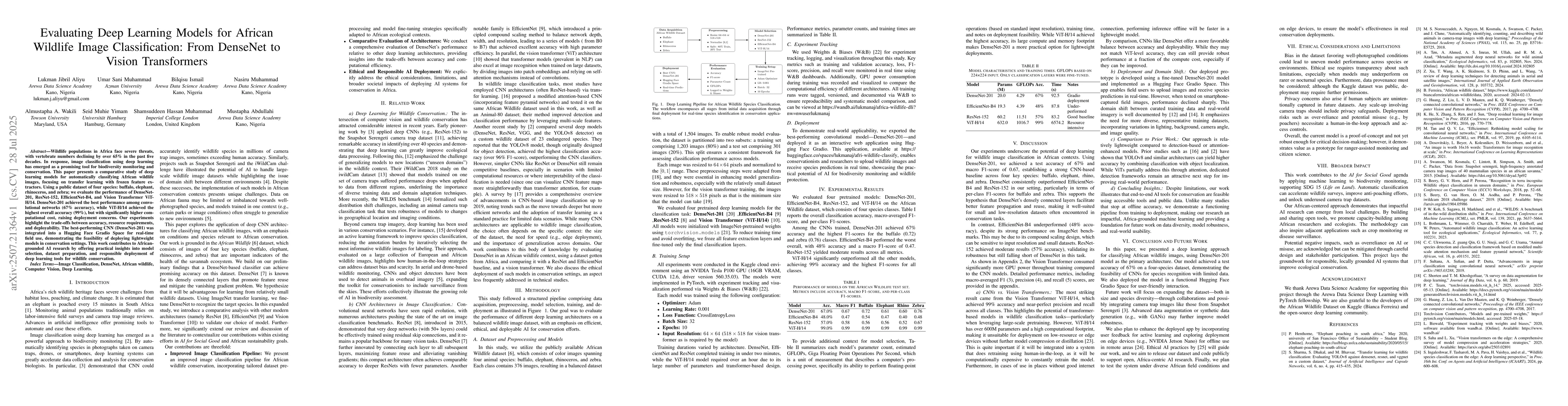 Wildlife populations in Africa face severe threats, with vertebrate numbers declining by over 65% in the past five decades. In response, image classification using deep learning has emerged as a promising tool for biodiversity monitoring and conservation. This paper presents a comparative study of deep learning models for automatically classifying African wildlife images, focusing on transfer learning with frozen feature extractors. Using a public dataset of four species: buffalo, elephant, rhinoceros, and zebra; we evaluate the performance of DenseNet-201, ResNet-152, EfficientNet-B4, and Vision Transformer ViT-H/14. DenseNet-201 achieved the best performance among convolutional networks (67% accuracy), while ViT-H/14 achieved the highest overall accuracy (99%), but with significantly higher computational cost, raising deployment concerns. Our experiments highlight the trade-offs between accuracy, resource requirements, and deployability. The best-performing CNN (DenseNet-201) was integrated into a Hugging Face Gradio Space for real-time field use, demonstrating the feasibility of deploying lightweight models in conservation settings. This work contributes to African-grounded AI research by offering practical insights into model selection, dataset preparation, and responsible deployment of deep learning tools for wildlife conservation.