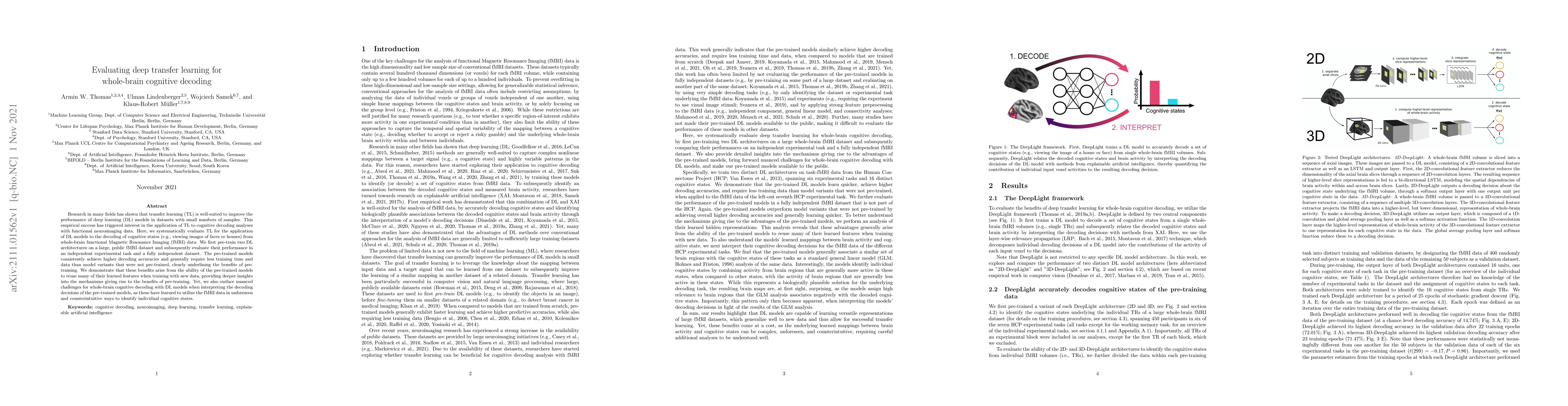 This study evaluates deep transfer learning for decoding cognitive states from whole-brain fMRI data, showing that pre-trained deep learning models achieve higher decoding accuracy and require less training data compared to non-pre-trained models. However, it also highlights challenges in interpreting the learned features of pre-trained models.
