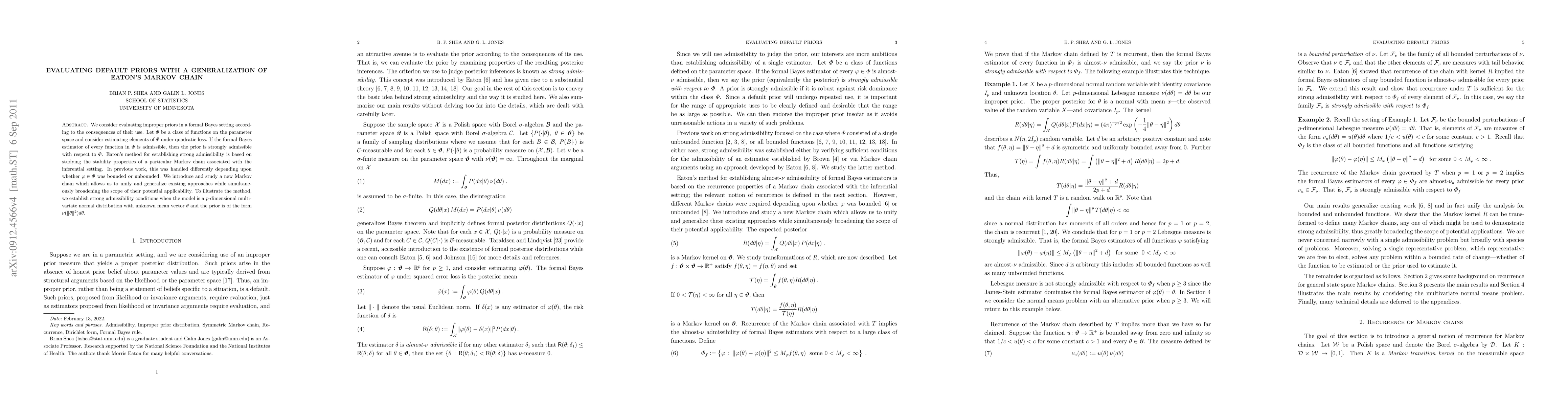 We consider evaluating improper priors in a formal Bayes setting according to the consequences of their use. Let $\Phi$ be a class of functions on the parameter space and consider estimating elements of $\Phi$ under quadratic loss. If the formal Bayes estimator of every function in $\Phi$ is admissible, then the prior is strongly admissible with respect to $\Phi$. Eaton's method for establishing strong admissibility is based on studying the stability properties of a particular Markov chain associated with the inferential setting. In previous work, this was handled differently depending upon whether $\phi \in \Phi$ was bounded or unbounded. We introduce and study a new Markov chain which allows us to unify and generalize existing approaches while simultaneously broadening the scope of their potential applicability. To illustrate the method, we establish strong admissibility conditions when the model is a $p$-dimensional multivariate normal distribution with unknown mean vector $\theta$ and the prior is of the form $\nu(\|\theta\|^{2})d\theta$.