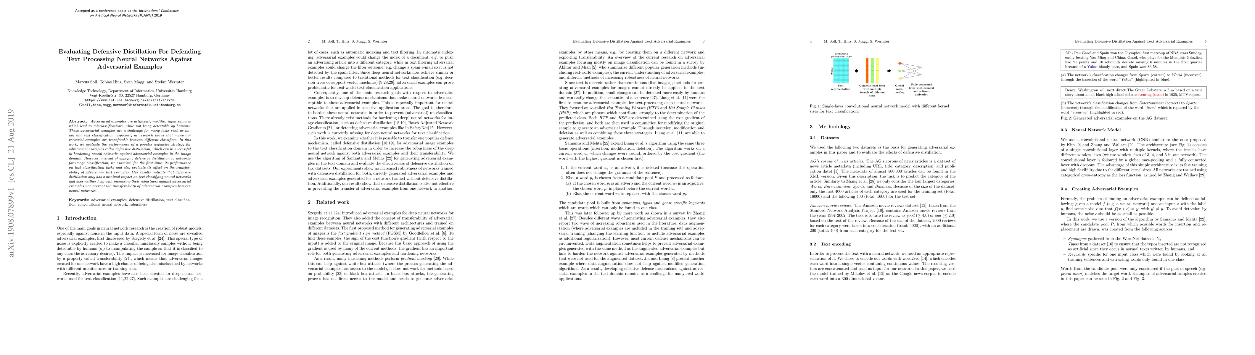 This study evaluates defensive distillation's effectiveness for protecting text classification neural networks against adversarial examples, finding minimal impact on robustness and transferability. Defensive distillation shows no significant improvement in defending text networks compared to its success in image classification.