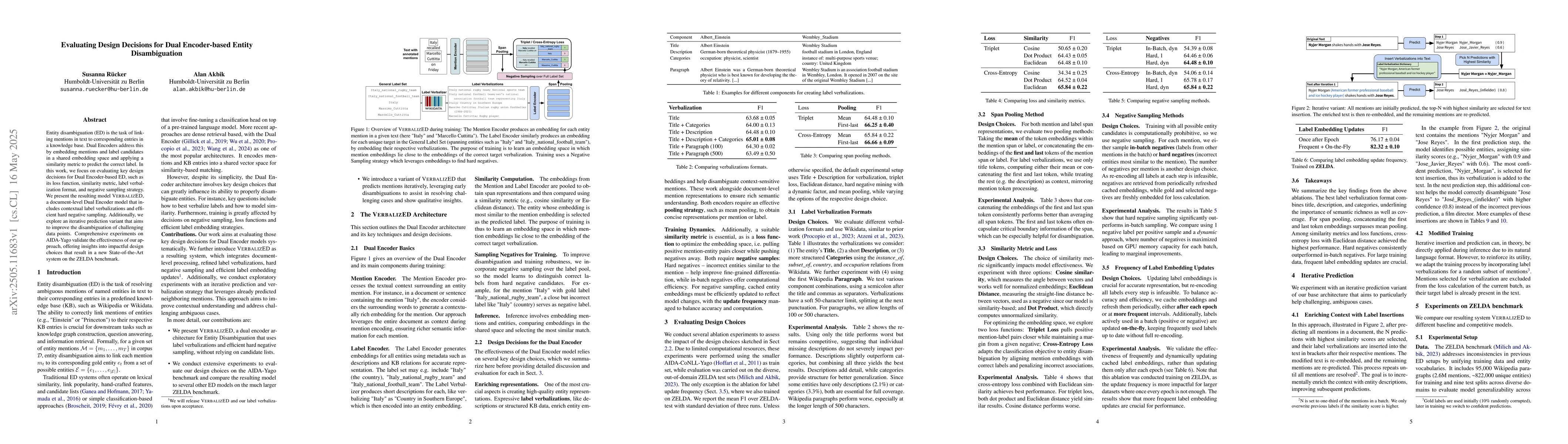 Entity disambiguation (ED) is the task of linking mentions in text to corresponding entries in a knowledge base. Dual Encoders address this by embedding mentions and label candidates in a shared embedding space and applying a similarity metric to predict the correct label. In this work, we focus on evaluating key design decisions for Dual Encoder-based ED, such as its loss function, similarity metric, label verbalization format, and negative sampling strategy. We present the resulting model VerbalizED, a document-level Dual Encoder model that includes contextual label verbalizations and efficient hard negative sampling. Additionally, we explore an iterative prediction variant that aims to improve the disambiguation of challenging data points. Comprehensive experiments on AIDA-Yago validate the effectiveness of our approach, offering insights into impactful design choices that result in a new State-of-the-Art system on the ZELDA benchmark.