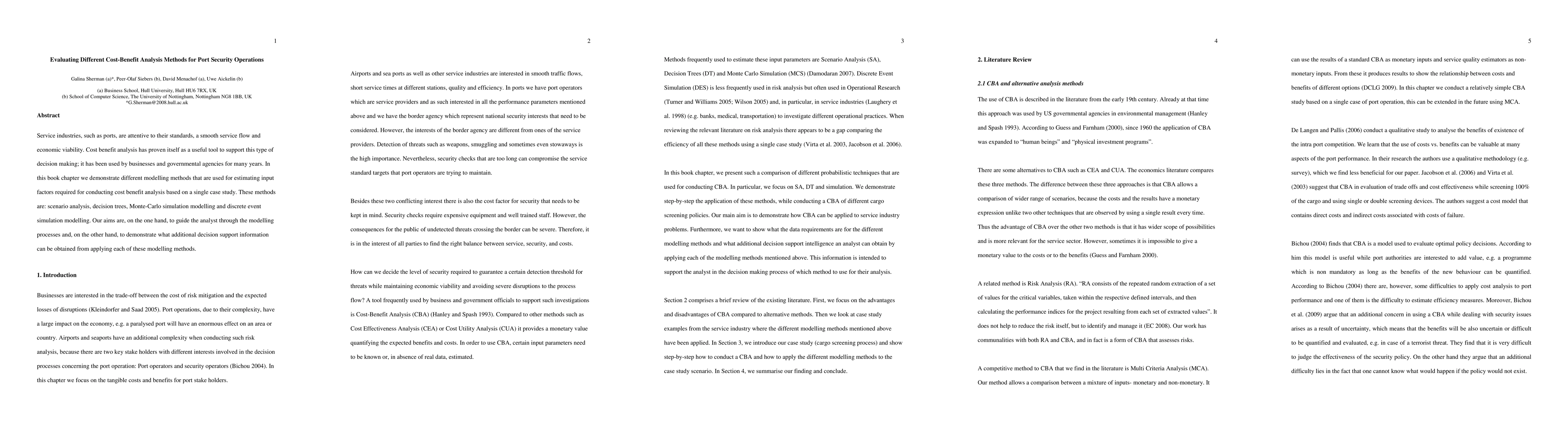 This paper evaluates various cost-benefit analysis methods—scenario analysis, decision trees, Monte-Carlo simulation, and discrete event simulation—for port security operations, using a single case study to guide analysts through the modelling processes and to highlight the additional decision support information each method provides.