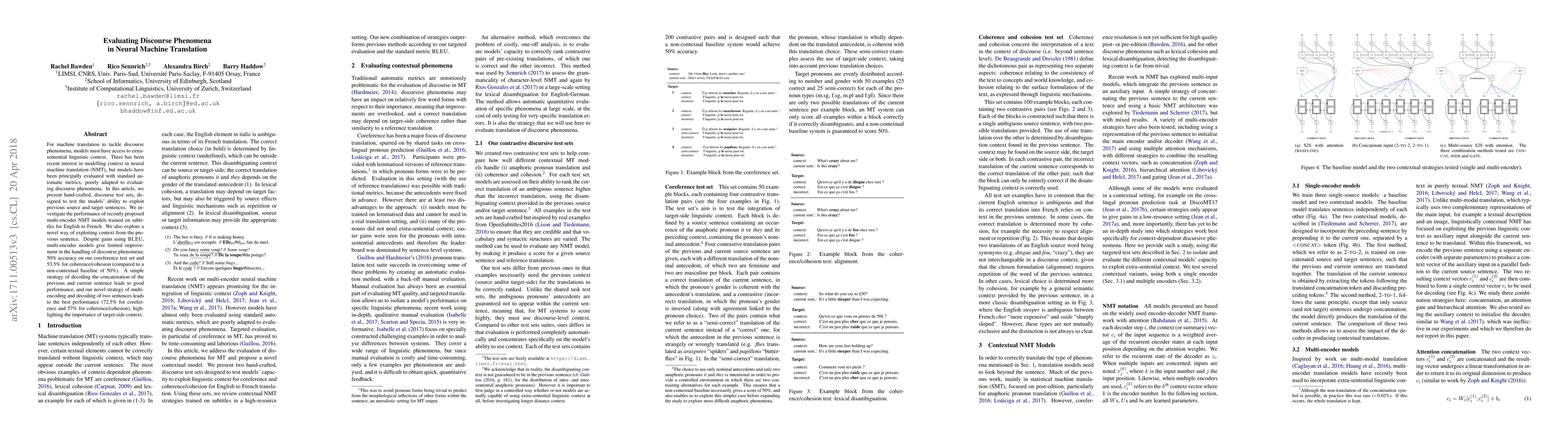 This paper evaluates neural machine translation models' ability to handle discourse phenomena by introducing new test sets that assess context exploitation. Despite improvements in BLEU scores, multi-encoder models show limited gains in discourse handling, achieving 50% accuracy for coreference and 53.5% for coherence/cohesion, while a novel multi-encoding strategy yields the best results at 72.5% and 57%.