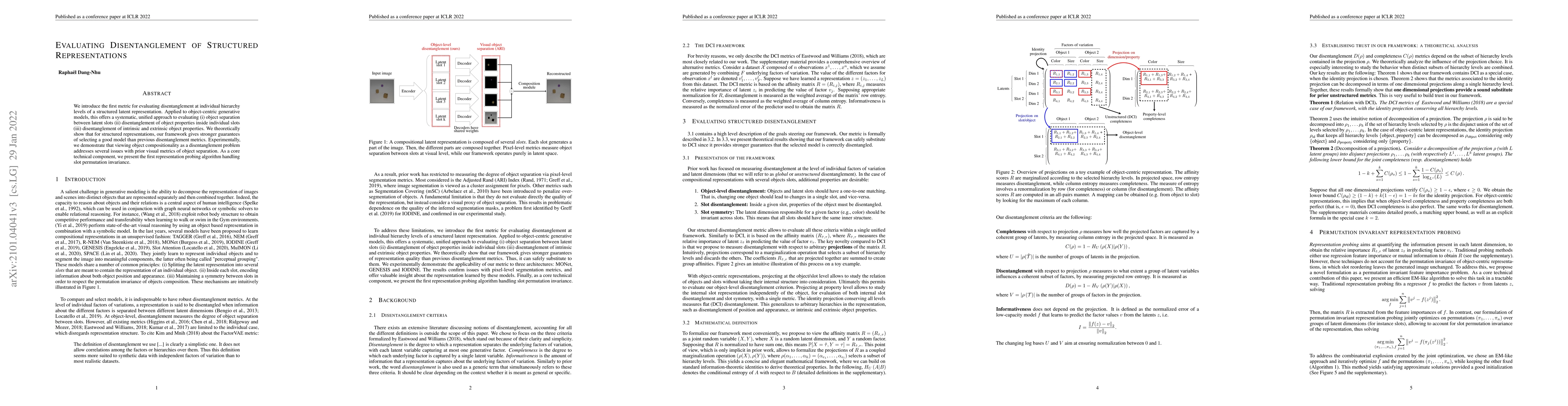 This paper introduces a new metric for evaluating disentanglement in structured latent representations, particularly for object-centric generative models, addressing object separation, internal property disentanglement, and intrinsic vs. extrinsic property disentanglement. The proposed framework provides stronger guarantees for model selection compared to previous metrics and offers a novel representation probing algorithm for slot permutation invariance.