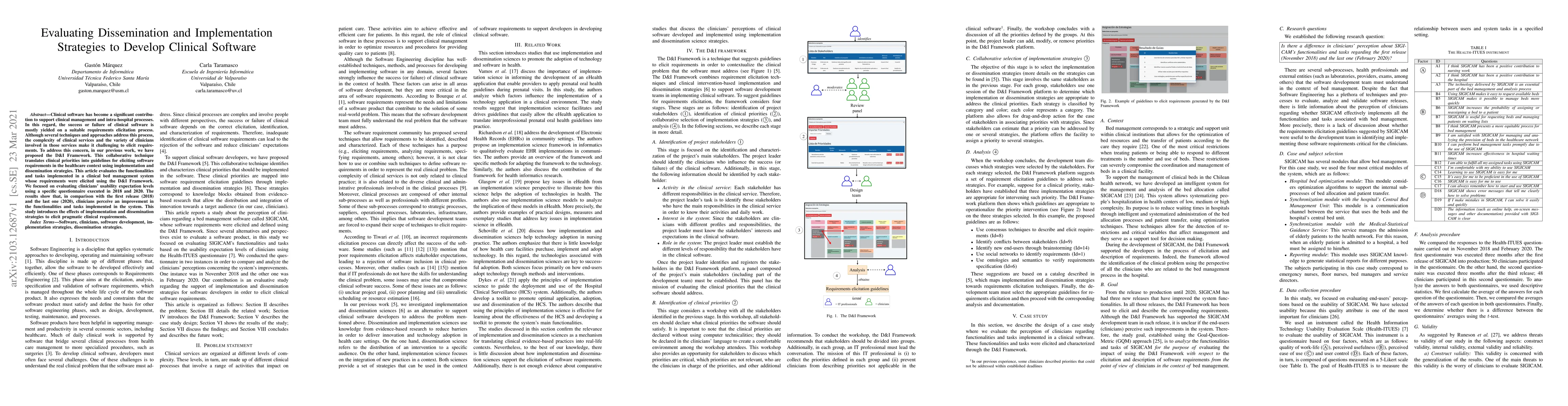 Clinical software has become a significant contribution to support clinical management and intra-hospital processes. In this regard, the success or failure of clinical software is mostly yielded on a suitable requirements elicitation process. Although several techniques and approaches address this process, the complexity of clinical services and the variety of clinicians involved in those services make it challenging to elicit requirements. To address this concern, in our previous work, we have proposed the D&I Framework. This collaborative technique translates clinical priorities into guidelines for eliciting software requirements in the healthcare context using implementation and dissemination strategies. This article evaluates the functionalities and tasks implemented in a clinical bed management system whose requirements were elicited using the D&I Framework. We focused on evaluating clinicians' usability expectation levels using a specific questionnaire executed in 2018 and 2020. The results show that, in comparison with the first release (2018) and the last one (2020), clinicians perceive an improvement in the functionalities and tasks implemented in the system. This study introduces the effects of implementation and dissemination strategies to elicit pragmatic clinical requirements.