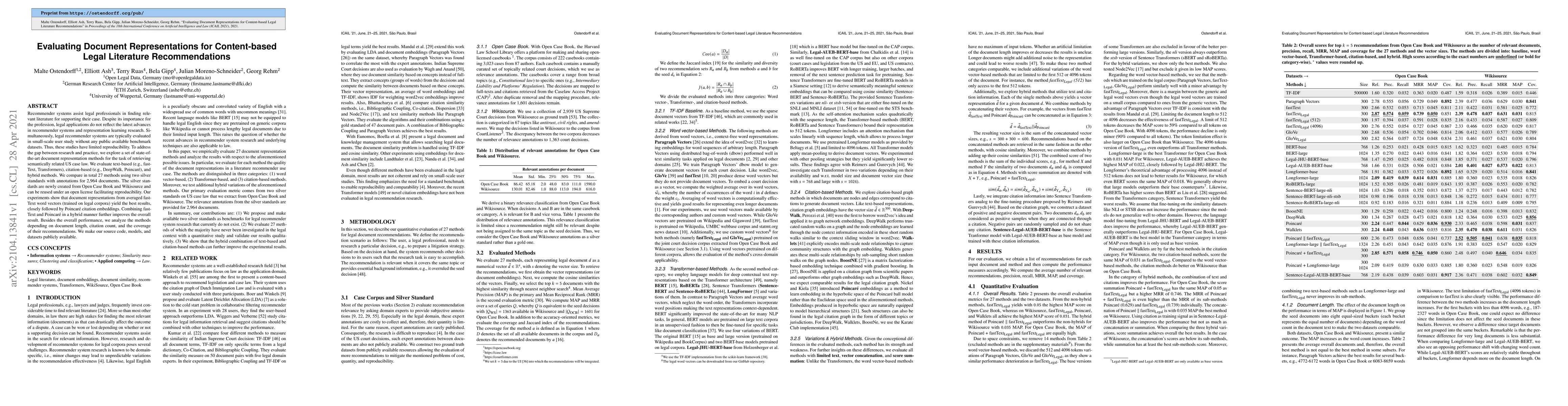 Recommender systems assist legal professionals in finding relevant literature for supporting their case. Despite its importance for the profession, legal applications do not reflect the latest advances in recommender systems and representation learning research. Simultaneously, legal recommender systems are typically evaluated in small-scale user study without any public available benchmark datasets. Thus, these studies have limited reproducibility. To address the gap between research and practice, we explore a set of state-of-the-art document representation methods for the task of retrieving semantically related US case law. We evaluate text-based (e.g., fastText, Transformers), citation-based (e.g., DeepWalk, Poincar\'e), and hybrid methods. We compare in total 27 methods using two silver standards with annotations for 2,964 documents. The silver standards are newly created from Open Case Book and Wikisource and can be reused under an open license facilitating reproducibility. Our experiments show that document representations from averaged fastText word vectors (trained on legal corpora) yield the best results, closely followed by Poincar\'e citation embeddings. Combining fastText and Poincar\'e in a hybrid manner further improves the overall result. Besides the overall performance, we analyze the methods depending on document length, citation count, and the coverage of their recommendations. We make our source code, models, and datasets publicly available at https://github.com/malteos/legal-document-similarity/.