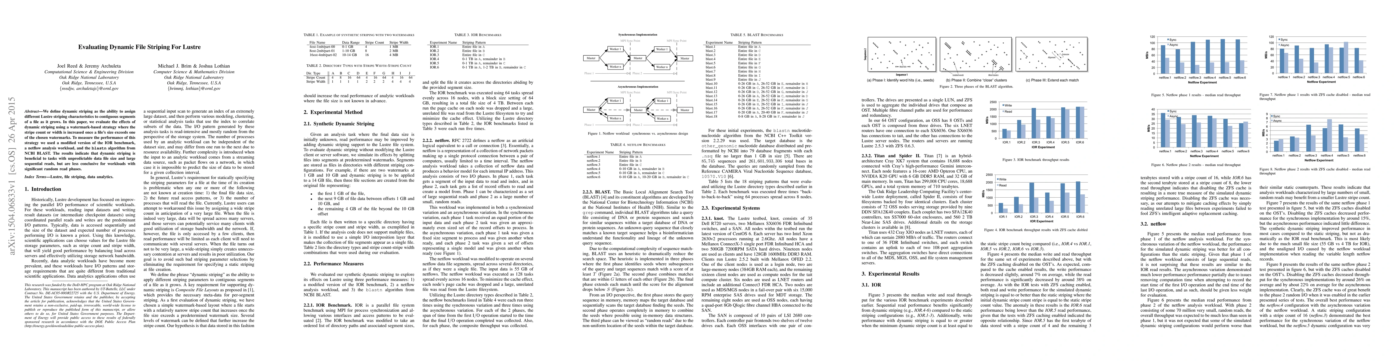 This paper evaluates dynamic file striping in Lustre, where striping characteristics change as files grow, using a watermark-based strategy. Results show improved performance for tasks with unpredictable file sizes and large sequential reads, but less clear benefits for workloads with significant random reads.