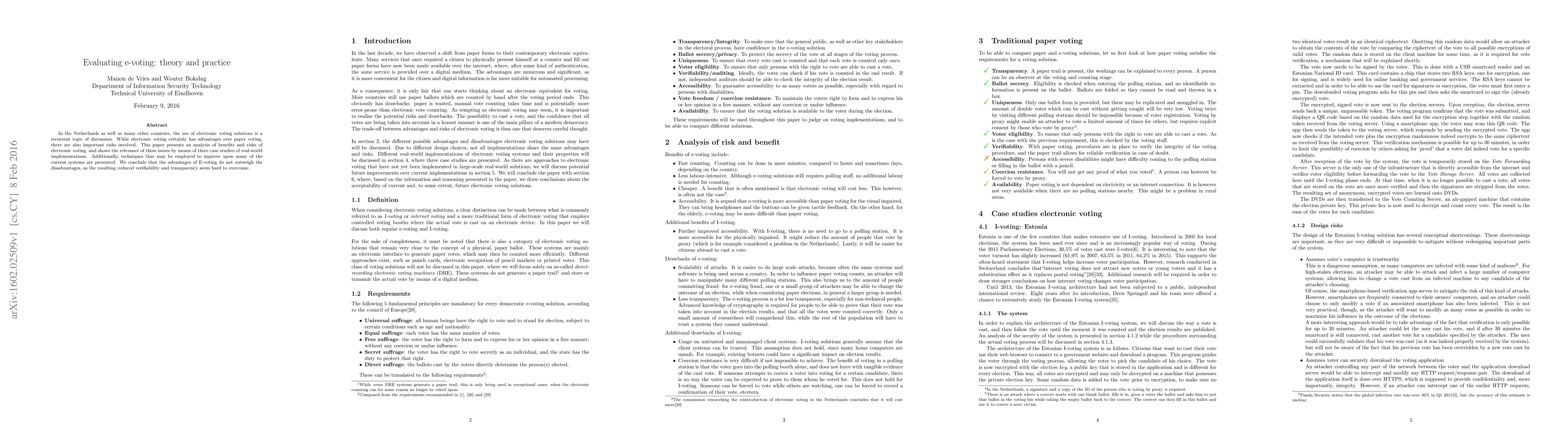 In the Netherlands as well as many other countries, the use of electronic voting solutions is a recurrent topic of discussion. While electronic voting certainly has advantages over paper voting, there are also important risks involved. This paper presents an analysis of benefits and risks of electronic voting, and shows the relevance of these issues by means of three case studies of real-world implementations. Additionally, techniques that may be employed to improve upon many of the current systems are presented. We conclude that the advantages of E-voting do not outweigh the disadvantages, as the resulting reduced verifiability and transparency seem hard to overcome.